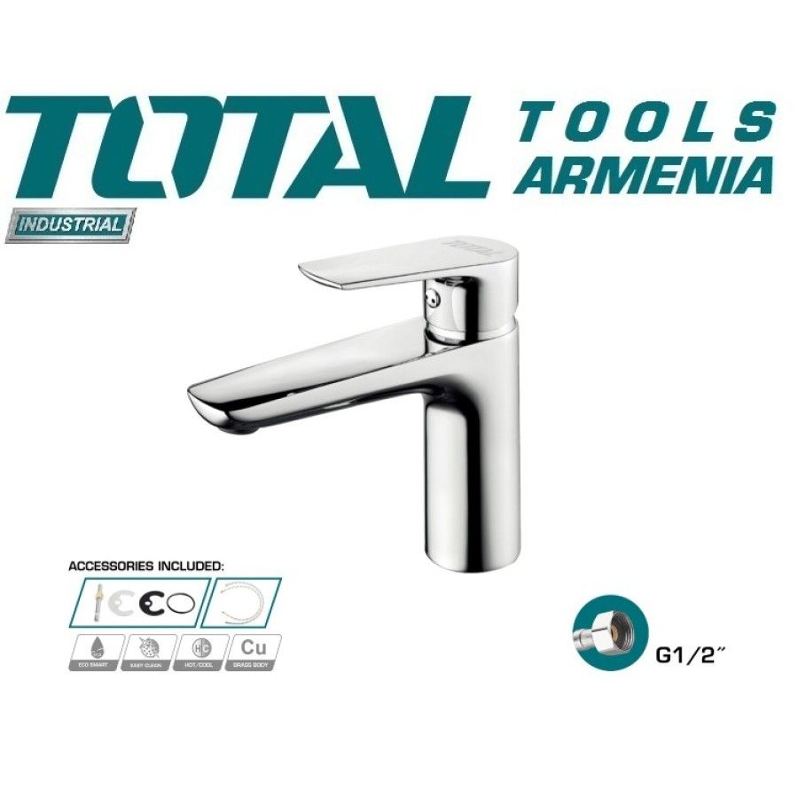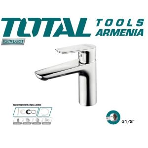 Смеситель для умывальника однорычажный TOTAL TSLBM11501 Высота 158 мм Внешний диаметр 45 мм Входной гибкий шланг 1/2 дюйма Надежная вставка регулятора расхода Качественный керамический картридж. Полированный и хромированный