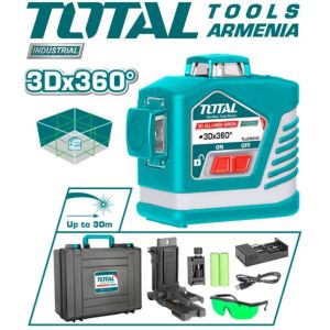 3D Лазерный нивелир зеленый TOTAL TLL255245 Рабочий диапазон: 0 ~ 30 м Точность линии ± 0,3 мм/м С 2 лазерными линиями: 1 вертикальная и 1 горизонтальная Ширина лазерной линии 2 мм ± 0,5/5 мм Лазер класса II Рабочая темп. -10°С - +50°С Температура хранения -20°С - +60°С С функцией перекрестного замка Зеленые лазерные лучи 360 градусов три плоскости литиевая батарея 4000 мАч Диапазон самонивелирования ± 4 ° Упакован в пластиковую коробку Размеры 128х80х120мм Вес 480гр ± 10гр