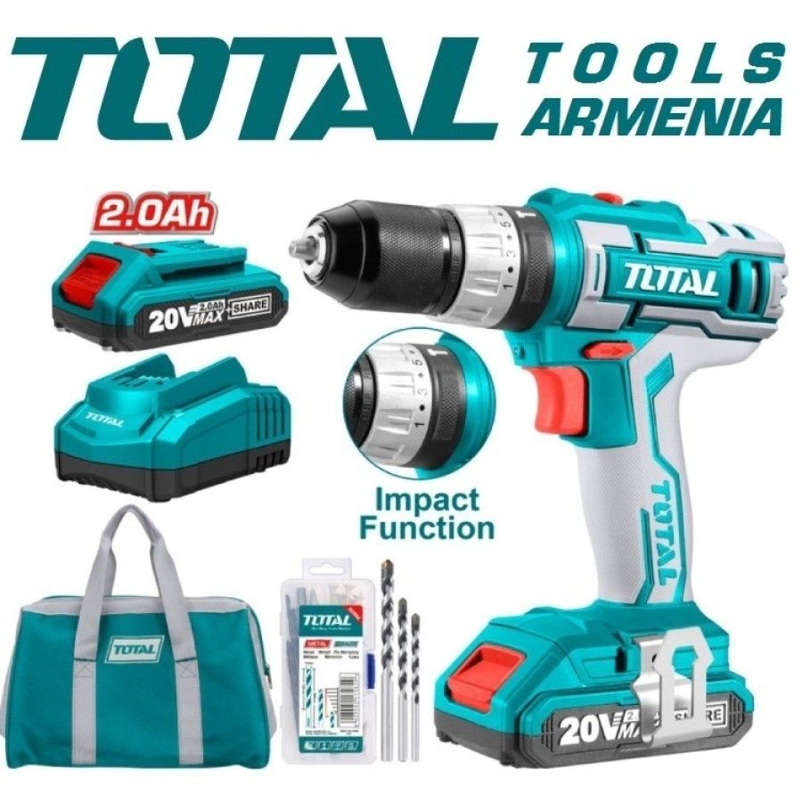 АккумуляторнаяУдарная Дрель - отвертка (шуруповерт)TotalTIDLI20025 20 В , 45Нм + 1 батарея Ударная дрельTIDLI20025 имеет 3 функции: дрель / резьбовой молоток / отвертка, продукт поставляется в очень солидном матерчатом мешке, включая: 1 корпус, 1 зарядное основание и 2 батареи . Аккумуляторный молоток TotalTIDLI20025 является частью нового продукта, который Total выпускает в 2019 году, высокого качества, но с низкой ценой. Этот продукт питается от литиевой батареи 20 В, новая технология батареи должна помочь сделатьпродукт у более прочной и продлить срок ее эксплуатации, корпус изготовлен из слоя АБС, выдерживает силу и хорошая теплостойкость. Устройство имеет компактную конструкцию, которая удобна для хранения и переноски при необходимости.