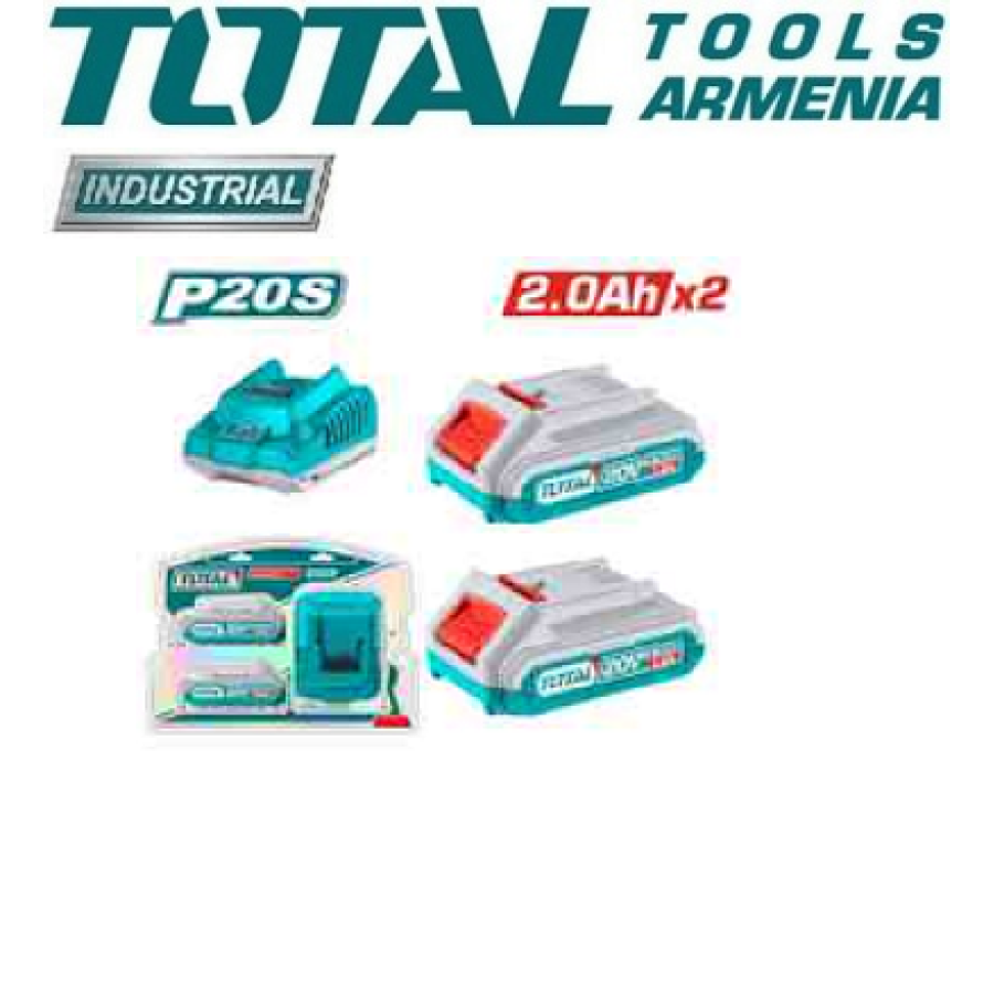 Литий-ионный аккумулятор и комплект зарядного устройства TOTAL TFBCPK1222 Напряжение аккумулятора: 20 В. С литий-ионным аккумулятором 2шт ( TFBLI20011 ). С зарядным устройством 1 шт. ( TFCLI2001 ). Литий-ионный аккумулятор емкостью 2,0 Ач. Индикатор заряда батареи. Одна батарея подходит для всех нескольких инструментов P20S. Входное напряжение: 220-240 В ~ 50/60 Гц. Выходное напряжение: 20В. Выходной ток: 2А. Упакован в двойной блистер.