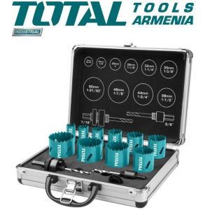 Набор биметаллических кольцевых пил из 12 предметов TOTAL TACSH1121 9 кольцевых пил: 20 мм (25/32 ″), 22 мм (7/8 ″), 25 мм (1 ″), 29 мм (1 1/8 ″), 32 мм (1 1/4 ″), 35 мм (1 3 / 8 ″), 38 мм (1 1/2 ″), 44 мм (1 3/4 ″), 48 мм (1 7/8 ″), 50 мм (1 31/32 ″) 1 шт. Оправка: 1/4 ″ круглый хвостовик, подходящий размер: 9/16 ″ ~ 1 3/16 ″. 1 шт. Оправка: 7/16 ″ шестигранный хвостовик, размер посадки: 1 1/4 ″ ~ 8 17/64 ″. 1 шт. Адаптер: для оправок с резьбой 1/2 ″ - 20 для кольцевых пил 5/8 ″ 18.