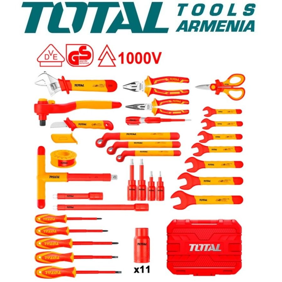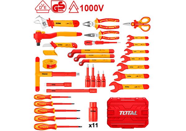 Набор диэлектрических инструментов 41шт TOTAL THKITH4101 Сертификация VDE / GS 1 шт. Изолированные длинногубцы: 160 мм (6 ″) 1 шт. Изолированные комбинированные плоскогубцы: 200 мм (8 ″) Изолированная шлицевая отвертка из 3 шт .: SL3.0x75 мм, SL4.0x100 мм, SL5.5x125 мм 2 отвертки с изолированной головкой Phillips: PH1x80 мм, PH2x100 мм 7 гаечных ключей с изолированным концом: 10 мм, 11 мм, 12 мм, 13 мм, 14 мм, 17 мм, 19 м 1 шт. Тестер напряжения: 3 мм x 70 мм 1 шт. Кабельный нож: 50 x 180 мм Изолированные ножницы электрика: 160 мм (6 ″) - 1 шт. 1 шт. Изолированный разводной ключ: 250 мм (10 ″) 1 шт. Виниловая электрическая лента 11 изолированных шестигранных головок (1/2 ″): 12 мм, 13 мм, 14 мм, 16 мм, 17 мм, 19 мм, 22 мм, 24 мм, 27 мм, 30 мм, 32 мм 4 изолированные головки для шестигранных винтов (1/2 ″): 4 мм, 5 мм, 6 мм, 8 мм Изолированный кольцевой гаечный ключ из 3 шт .: 14 мм, 17 мм, 19 мм 2 изолированные удлинители (1/2 ″): 125 мм, 250 мм Изолированный ключ с храповым механизмом 1/2 ″ - 1 шт. Изолированный Т-образный гаечный ключ 1/2 ″ 1 шт. Упаковано в пластиковую коробку