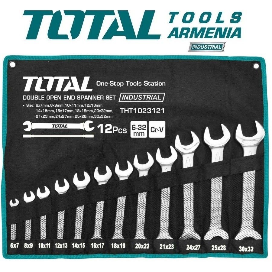 Набор гаечных рожковых ключей 12шт. TOTAL THT1023121 Размер мин. 6мм Размер макс. 32мм Материал Cr-V Количество в наборе 12шт. Форма прямой Размеры ключей 6x7мм, 8x9мм, 10x11мм, 12x13мм, 14x15мм, 16x17мм, 18x19мм, 20x22мм,21x23 мм , 24x27 мм , 25x28 мм , 30x32 мм. Набор гаечных рожковых ключей 12шт. TOTAL THT1023121 — универсальный комплект ручных инструментов для выполнения крепежных работ с гайками и болтами. В набор входят ключи наиболее распространенных размеров.Для удобства хранения и транспортировки ключи поставляются в чехле из ткани.
