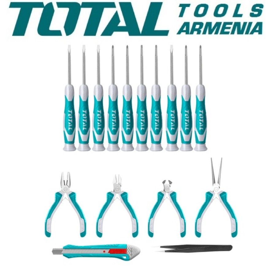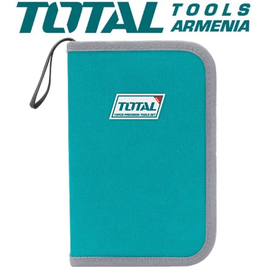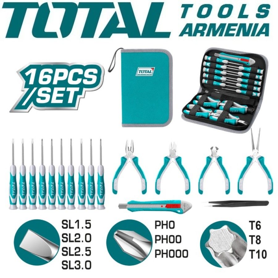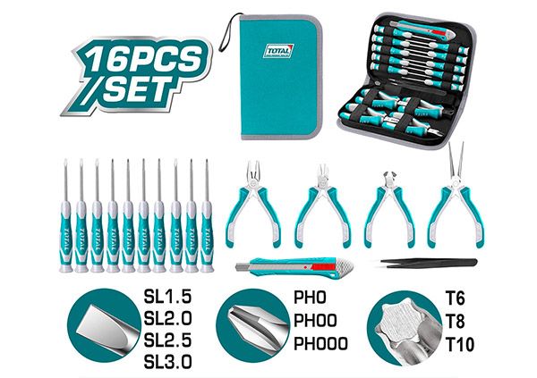 Набор инструментов 16 шт. TOTAL TKTTSK0162 1 шт. Комбинированные плоскогубцы, 4,5 дюйма 1 шт. Плоскогубцы с длинными губками, 4,5 дюйма 1 шт. Диагональные кусачки, 4,5 дюйма 1 шт. Плоскогубцы для обрезки крайов, 4,5 дюйма 10 прецизионных отверток, SL1.5 x 50, SL2.0 x 50, SL2.5 x 50, SL3.0 x 50, PH0 x 50, PH00 x 50, PH000 x 50, T6 x 50, T8 x 50, T10 х 50 1 шт. Пинцет, 125 мм 1шт выдвижной нож