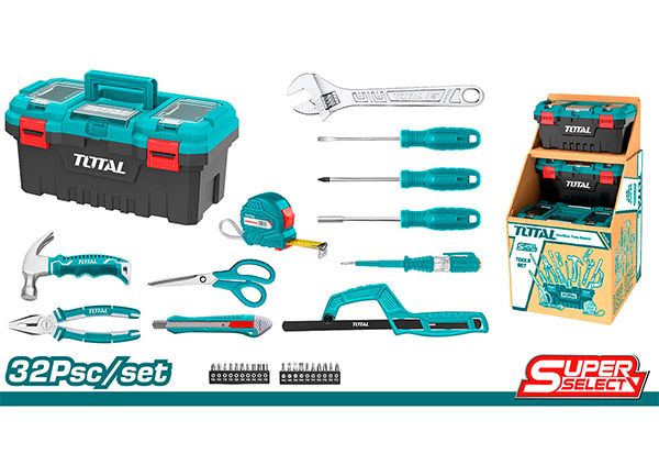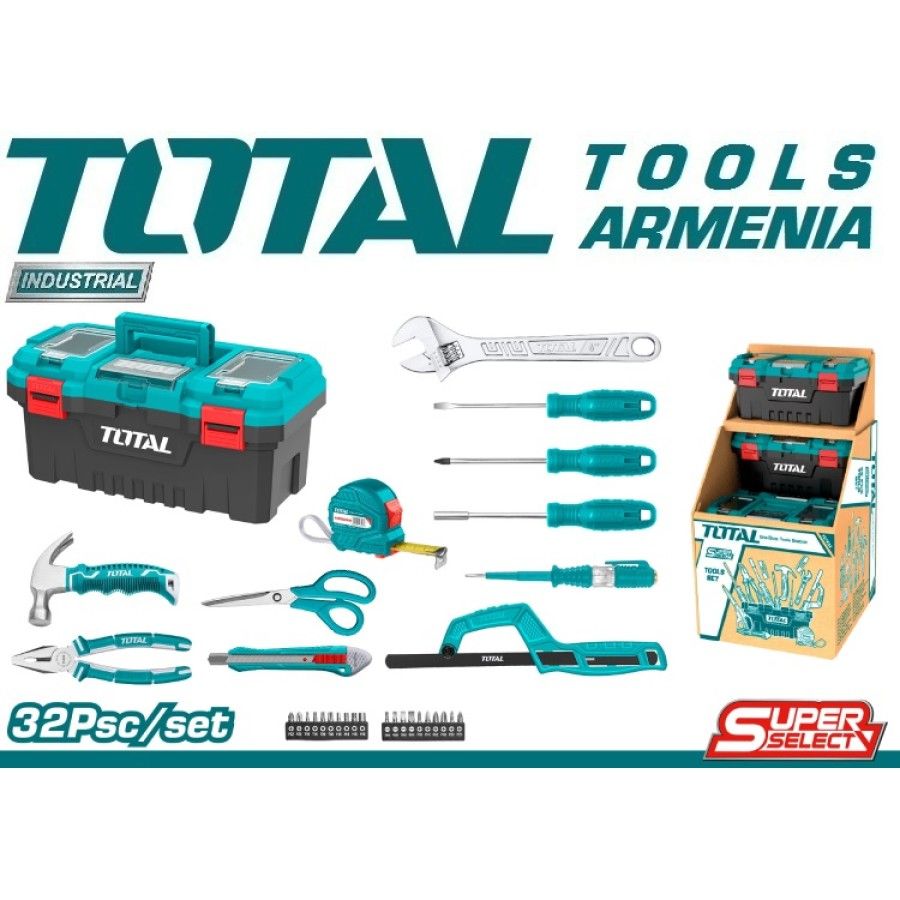 Набор инструментов из 32 предметов TOTAL THKTHP20326 1 шт. 1/4″ магнитный держатель бит 1 шт. молоток для гвоздей 1 шт. Комбинированные плоскогубцы, 7″ 1 шт. Шлицевая отвертка, SL5,5 x 100 мм 1 отвертка Phillips, PH1 x 100 мм 1 шт тестовый карандаш 1 шт. 3 м измерительная лента 1 шт выдвижной нож 1 шт ножницы, 8" 1 шт мини-ножовка 20 бит 1/4": SL3, SL4, SL5, SL6, PH0, PH1, PH2, PH3, PZ0, PZ1, PZ2, PZ3, T10, T15, T20, T30, H3, H4, H5, H6 1 шт пластиковая коробка, 17" Вес 2,9 кг