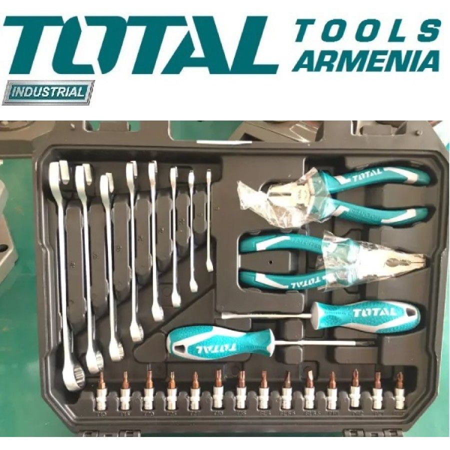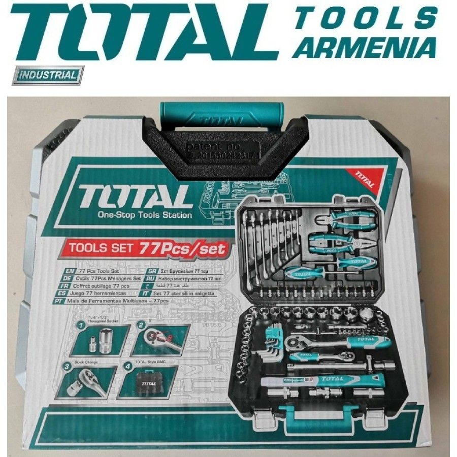 Набор инструментов из 77 предметов TOTAL THKTHP20776 1 шт. 1/2 ″ ключ с трещоткой (45 зуб.) 18 шестигранных головок 1/2 ″: 10 мм, 11 мм, 12 мм, 13 мм, 14 мм, 15 мм, 16 мм, 17 мм, 18 мм, 19 мм, 20 мм, 21 мм, 22 мм, 23 мм, 24 мм, 27 мм, 30 мм, 32 мм 1 шт. 1/2 ″ Удлинитель: 250 мм 1 шт. 1/2 ″ Универсальный шарнир 2 шт. Свеча зажигания 1/2 ″: 16 мм, 21 мм 1 шт. Трехходовой адаптер: от 1/2 ″ до 3/8 ″ 1 шт. 1/4 ″ ключ с трещоткой (45 зуб.) 13 шестигранных головок 1/4 ″: 4 мм, 4,5 мм, 5 мм, 5,5 мм, 6 мм, 7 мм, 8 мм, 9 мм, 10 мм, 11 мм, 12 мм, 13 мм, 14 мм 1 шт. 1/4 ″ Удлинитель: 100 мм 1 шт. 1/4 ″ сдвижная Т-образная штанга 1 шт. 1/4 ″ Универсальный шарнир Комбинированные ключи, 8 шт .: 6 мм, 8 мм, 10 мм, 12 мм, 14 мм, 15 мм, 17 мм, 19 мм 1 шт. Молоток механический, 300 г 1 шт. Клещи комбинированные, 7 ″ 1 шт. Длинногубцы, 6 ″ Отвертка шлицевая, 1 шт., SL6.5 x 100мм Отвертка Phillips, PH2 x 100 мм, 1 шт. 14 шт. Головок с битами: T10, T15, T20, T25, T27, T30, T35, SL4, SL5.5, SL6.5, PH1, PH2, PZ1, PZ2 9 шестигранных ключей: 1,5 мм, 2 мм, 2,5 мм, 3 мм, 4 мм, 5 мм, 6 мм, 8 мм, 10 мм
