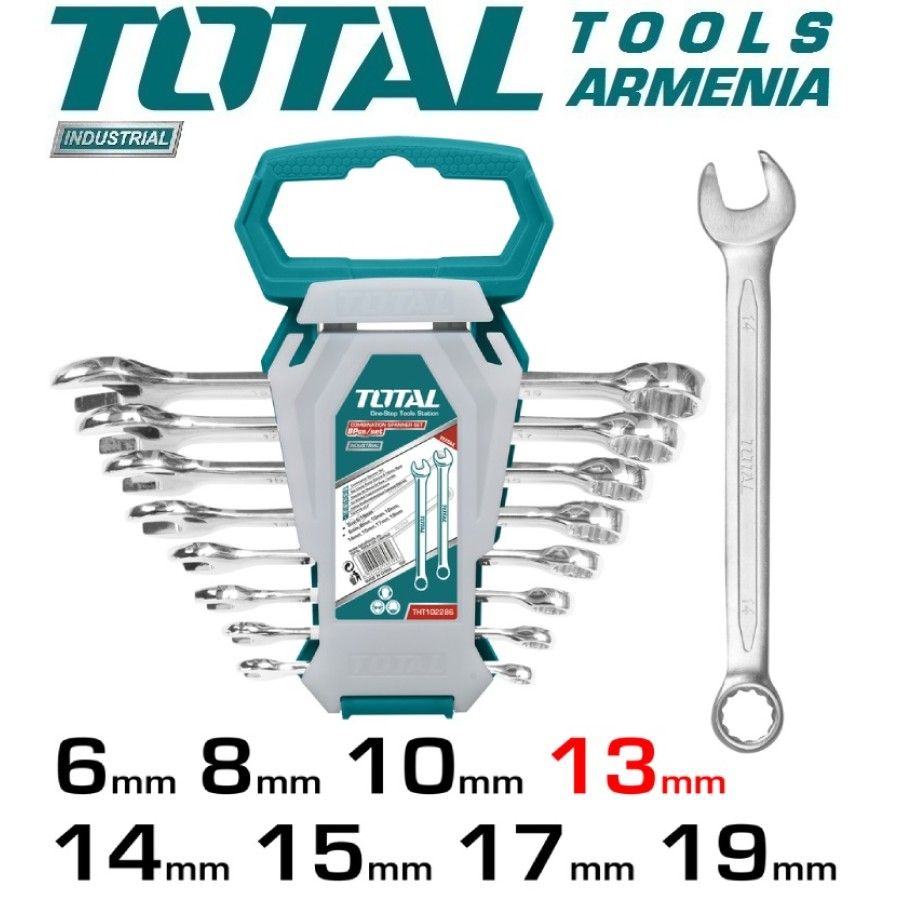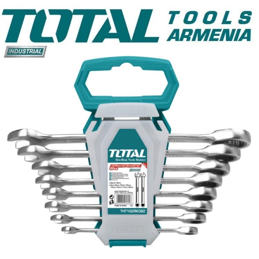 Набор ключей комбинированных трещоточных TOTAL THT102RK086 Размер мин. 8мм Размер макс. 19мм Тип комбинированные Покрытие хромированный Материал Cr-V Количество в наборе 8шт. Форма прямой Размеры ключей 8мм, 10мм, 12мм, 13мм, 14мм, 15мм, 17мм, 19мм, Набор ключей комбинированных трещоточных TOTAL THT102RK086 применяется для обслуживания резьбовых соединений. Корпусы ключей изготовлены из хромванадиевой стали, что обеспечивает их повышенную прочность и износоустойчивость. Изделия состоят из рожковых головок — с одной стороны, и трещоток — с другой. Материал трещотки - высокопрочный хром-молибден. Комплект поставляется с пластиковым держателем, позволяющим компактно и аккуратно хранить и перевозить инструменты.