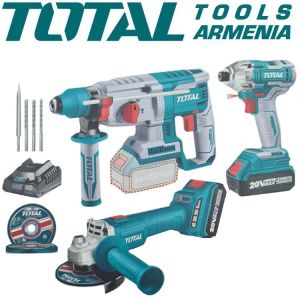 Набор литий-ионных инструментов 20 В, 3 предмета TOTAL TOSLI2301515 Перфоратор: TRHLI20228 Напряжение:20 В. Скорость без нагрузки:0 - 1100 об/мин. Частота ударов:0 - 5000 ударов в минуту. Сила удара:2,0 Дж. Максимальная глубина сверления в бетоне:26 мм. Встроенный рабочий свет. С системой патрона SDS plus. 3 сверлом,1 долотом. Ударный Винтоверт TIRLI2017 Напряжение:20 В. Бесщеточный двигатель Монтажное отверстие: шестигранник 6,35 Частота вращения:0-1300/0-2300 об/мин. Частота ударов:0-2000/0-3300 в/мин. Максимальная мощность:170 Нм. Устройство оснащено светодиодной подсветкой для освещения рабочей зоны. Угловая шлифовальная машина: TAGLI20157 Бесщеточный двигатель . Напряжение:20 В. Скорость вращения:3000 - 9000 об/мин. Диаметр диска:115 мм. Монтажное отверстие:M14. 1 шт. с отрезным диском по металлу, 2 шт. с аккумулятором 4,0 Ач,1 шт. с зарядным устройством. Упакован в красочную коробку.