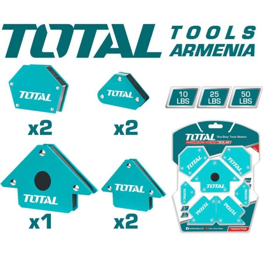 Набор магнитных сварочных держателей 7шт. TOTAL TAMWH7006 Тип - набор сварочных держателей. В комплекте - 2 держателя 3 дюйма, 2 мини магнита, 2 держателя 3 дюйма 6 углов, 1 магнит 4 дюйма. Материал - магнит и сталь. Углы - 30°, 45°, 75°, 90°, 105°, 120°, 135°. Тяговое усилие 25 фунтов, 10 фунтов, 50 фунтов. Упаковано двойным блистером. Мощные уголки для магнитной сварки, держатели для панелей, труб или других свариваемых деталей. Позволяет точно совмещать углы в процессе сварки, монтажа металлоконструкций. Магнитный сварочный аппарат - вторая рука сварщика. Больше не нужно обращаться за помощью - благодаря приспособлению для магнитной сварки - весь процесс может выполнять один рабочий, что значительно упрощает процесс изготовления необходимой конструкции.