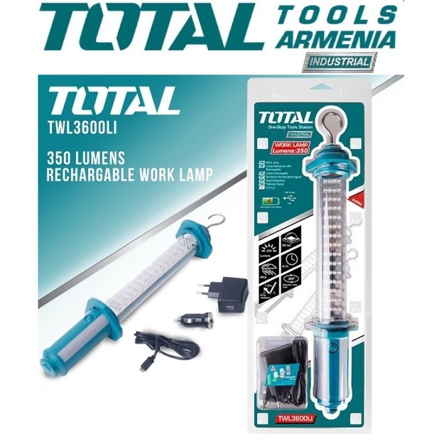Перезаряжаемая рабочая светодиодная лампа 5 В Total TWL3600LI Лампа имеет яркую яркость, не мерцает при непрерывном использовании в течение 3 часов при ярком освещении или 7 часов при слабом освещении.Быстрое время зарядки при условии надлежащего обслуживания. В комплект входят:1 зарядное устройствоUSB-кабельМодулятор автомобильный через USB Тип батареи : Литий-полимерный аккумулятор 3.7 В . Производительность в люменах: 170 - 350люмен . Емкость аккумулятора: 3.6 А*ч . Яркий режим 350люмен (высокая) - 170люмен (низкая), без мерцания . Время освещения: 3,5-4 часа (при высокой освещенности) . Время освещения: 7 часов (при низкой освещенности) . 3 режима освещения . IPX4 устойчив к дожде . Магнитная основа . Функция крюка для подвешивания . Количество LED60 штук . В ес : 315 гр .