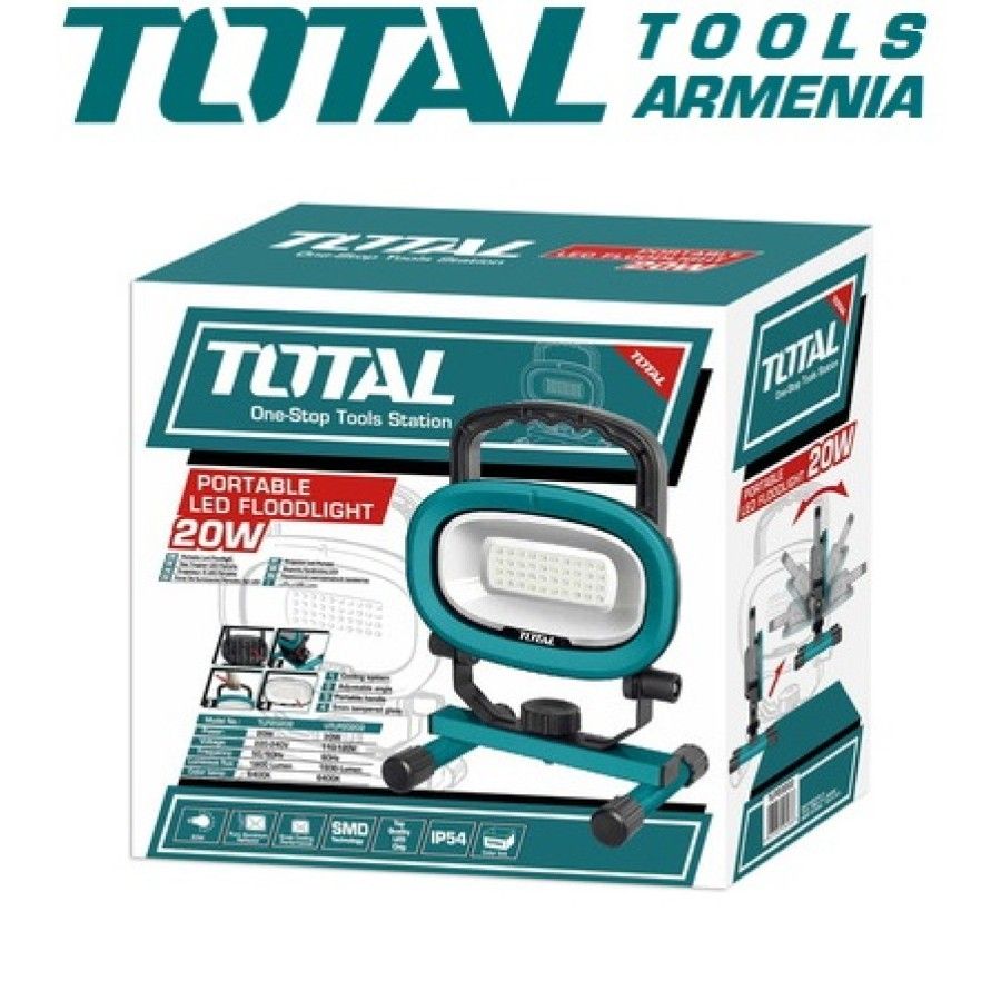 Портативный светодиодный прожектор 20 Вт TOTALTLP20202 Напряжение: 220 - 240 В - 50/60 Гц. Мощность: 20 Вт. Производительность люмен: 1600 люмен. Цветовая температура: 6500К. Цвет : белый .Количество LED 40 щука. Защита: IP54. С переключателем ВКЛ/ВЫКЛ. Измените угол с помощью храповика. Специальный пластиковый корпус радиатора. Кабель: 1,5 м с вилкой. Вес: 900 гр. Упаковано в цветную коробку.