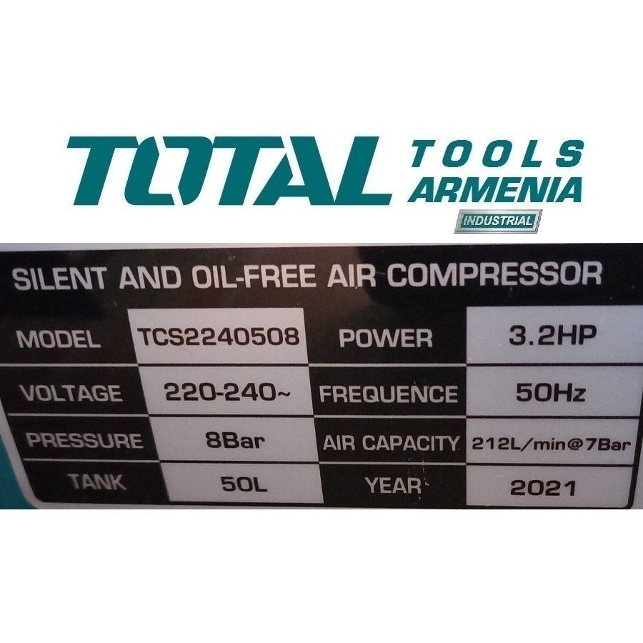 Тихий безмасляный воздушный компрессор 50 л 2400Вт TOTALTCS2240508 / ПРОМЫШЛЕННАЯ / INDUSTRIAL Тип - Тихий безмасляный воздушный компрессор . Тип компрессора - Безмасляная система . Напряжение - 220-240В. Частота - 50 Гц. Входная мощность - 2 x 1200 Вт. Число оборотов - 2850 об / мин. Объем бака - 50 л (13.2 галлона). Рабочее давление - макс. 8 бар (116 фунтов на кв. Дюйм). Производительность на входе - 220 л / мин.Производительность на входе - 212 л / минпри7 баре . Шум - 75 дБ. С ресивером; Легко перемещать; Удобный слив конденсата; Длительный срок службы. Транспортировочные колеса - 2 шт . Манометр - есть. Двигатель из медной проволоки и Двигатель с низким уровнем шума. Упаковано в картонную коробку . Тихий безмасляный воздушный компрессор TOTALTCS2240508 обладает высокой производительностью за счет прямого привода. Прочный корпус подходит для любых условий использования. Наличие колес и ручки для транспортировки обеспечивает мобильность, подходящую для строительных площадок или промышленных корпусов. Встроенный манометр позволяет легко контролировать степень сжатия воздуха и снижает вероятность поломки подключенного инструмента.