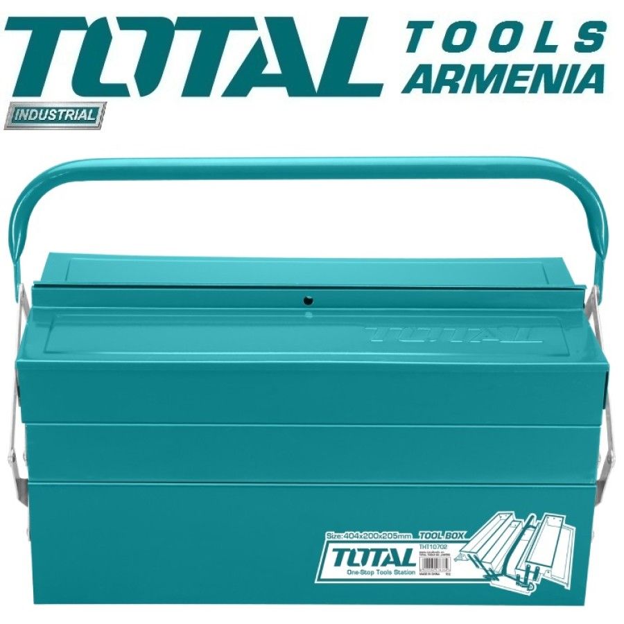 Ящик инструментальный 3 слоя TOTAL THT10702 Высота 195 мм Длина 400 мм Коробка форм-фактора (корпус) Металлическая ручка - да Размеры 400x200x195 мм Ширина 200мм Запись на ручной инструмент Материал сталь Толщина стали 0,6 - 0,8 мм Ящик для инструментов TOTAL THT10702 состоит из 5 секций, расположенных в 3 яруса, просторный и удобный. В нем можно аккуратно разместить инструменты и приспособления, компактно их хранить и транспортировать. Ящик изготовлен из прочной листовой стали, поэтому он прочен и устойчив к износу.