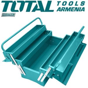 Ящик инструментальный TOTAL THT10701 Вес 5кг Высота 290 мм Длина 495 мм Коробка форм-фактора (корпус) Металлическая ручка - да Размеры 495x200x290 мм Ширина 200мм Запись на ручной инструмент Материал сталь Ящик для инструментов TOTAL THT10701 состоит из 5 секций, расположенных в 3 яруса, просторный и удобный. В нем можно аккуратно разместить инструменты и приспособления, компактно их хранить и транспортировать. Ящик изготовлен из прочной листовой стали, поэтому он прочен и устойчив к износу.