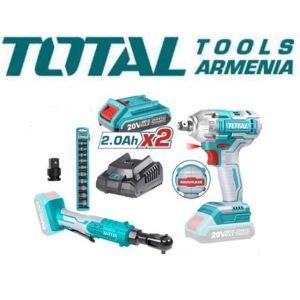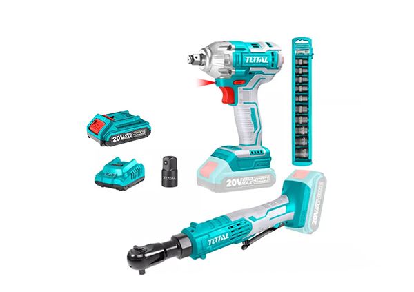 Аккумуляторный гайковерт и зажим 20 В TOTAl TOSLI23043 Коллекция включает в себя: 1шт Аккумуляторный ударный гайковерт TIWLI2038 . 1шт аккумуляторный зажим TDRLI20601 . Литий-ионный ударный гайковерт ( TIWLI2038 ). Напряжение: 20 В. Квадратный привод: ½ дюйма. Скорость: 0-1300/0-2300 об/мин. Количество ударов: 0-2000/0-3300 ударов в минуту. Максимальный крутящий момент: 300 Нм. Встроенный рабочий светодиод. Зажим аккумулятора ( TDRLI20601 ). Напряжение: 20 В. Скорость без нагрузки: 0-250 об/мин. Размер патрона : 3/8 дюйма. Максимальный крутящий момент: 65 Нм. В коллекцию также входят: 10шт ударная головка 1/2" DR. 1шт 3/8"-1/2" адаптер ударной головки DR. 2 батареи 2,0 Ач ( TFBLI20011 ). 1 зарядное устройство ( TFCLI2001 ). Напряжение: 220-240 В ~ 50/60 Гц.