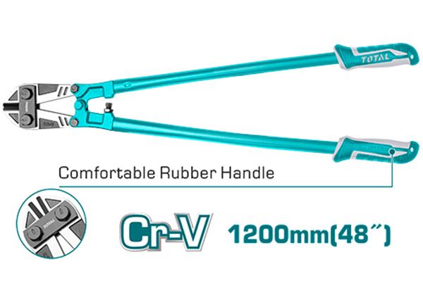 Болторез 1200mm TOTAL THT113486 Длина 1200мм Диаметр резки 22 мм Рукоятки-чехлы резиновый Материал губок Cr-V Болторез 1200 мм TOTAL THT113486 используется для перекусывания болтов, прутков, арматуры. Рабочая часть изделия выполнена из хромванадиевой стали, благодаря чему устойчива к деформации и коррозии. Рукоятки выполнены из полимерных материалов для комфортного выполнения работ и отсутствия скольжения. Длина болтореза - 1200 мм.