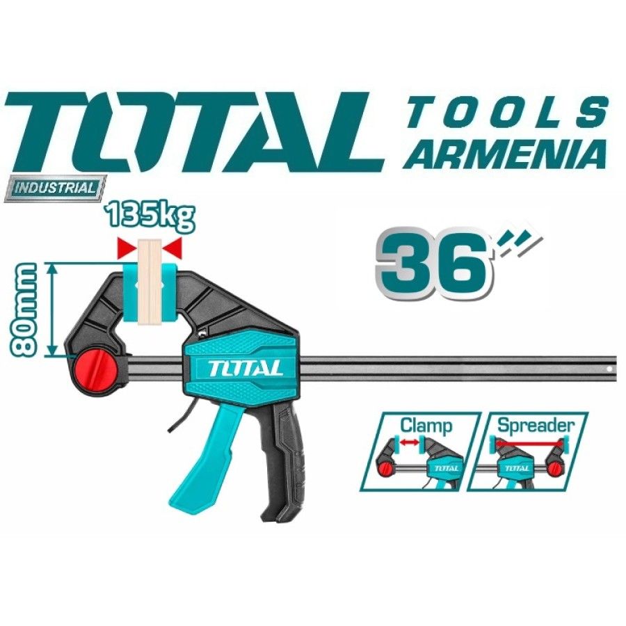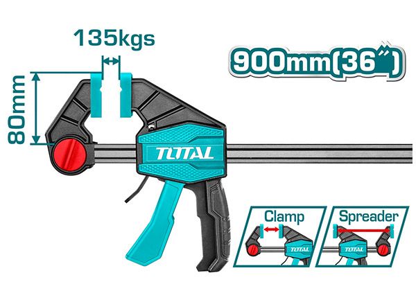 Быстрозажимная струбцина 80x900мм TOTAL THT1346803 Размер - 80х900мм. Максимальное усилие зажима - 135 кг. Толщина и ширина железной линейки - 6х18мм. Упаковано по этикетке. Быстрозажимная струбцина подходит для работы с различными материалами. Каркас выполнен из прочной стали. Инструмент удобен для ладони, не вызывает утомления и значительно упрощает работу техника, слесаря и других специалистов.