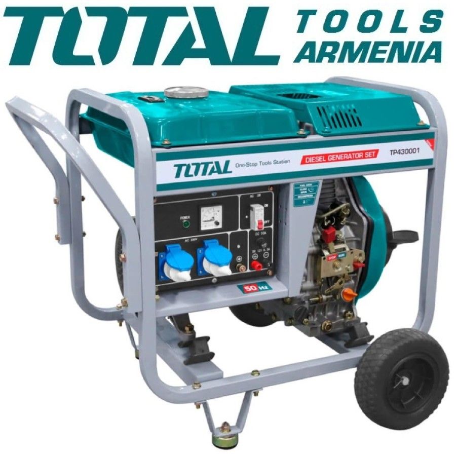 Дизель-генератор (стартер) Total TP430001 2800 Вт Генераторы дизельные TP430001,конструкция устройства элегантность, простота в эксплуатации и высокая долговечность при весе67 кг,включая колеса и ручное тяговое усилие, помогают легко перемещаться и удобно использовать в семье, на заводе. Удобная для пользователя полная панель управления. Автоматический выключатель переменного тока. Система AVR обеспечивает точный контроль напряжения. Не требующий обслуживания аккумулятор. Машина имеет компактную конструкцию, проста, удобна в перемещении и использовании. В случае сбоев энергоснабжения позволяет обеспечить освещениемдом, а также работу основных бытовых устройств (электрический чайник, холодильник, обогреватель и пр.). Машина работает плавно, малошумно. Двигатель легко заводится, чувствителен и экономичен. Максимальная мощность : 3000 Вт. Постоянная мощность: 2800 Вт. Регулятор напряжения: AVR. Переменный ток 2 x 220/240 В ~ 50 Гц .Оборудован аналоговым вольтметром. Постоянный ток 1 х 12 вольт (8,3 а). Н оминальная скорость : 3000об / мин․ Д вигатель : 4-Т актный Дизель. Рабочий объем цилиндра: 296 мл.Диаметр поршня X: 86 x 72 мм. Мощность двигателя: 5.7 л.с.Система охлаждения: вентилятором. Система запуска: Автоматическая блокировка. Система запуска: механическая + электрическая. Система зажигания: TCI. Емкость топливного бака: 15 Л.Большой металлический топливный бак с сетчатым фильтром. Емкость масла: 1,65 л.Индикатор уровня масла. Масло: SAE 15W30, 15W40. Уровень шума: 95 дБ.Оборудован колесами и ручками, обеспечивающими легкое перемещение генератора. Вес: 67 кг. Гарантия։ 1 год. - Дизель-генераторы более экономичны, чем бензиновые. - Дизельный двигатель сильнее и мощнее, работает быстрее, что позволяет экономить топливо, а расходы на топливо дешевы - Электроэнергия, вырабатываемаядизельными генераторами, на 11% выше, чем бензиновые генераторы. -Дизельныйгенераторы не вызывают антисанитарии и не выделяют много дыма, который загрязняет окружающую среду.