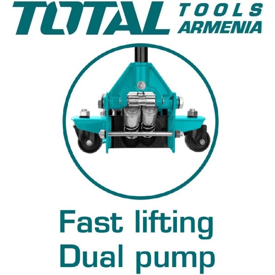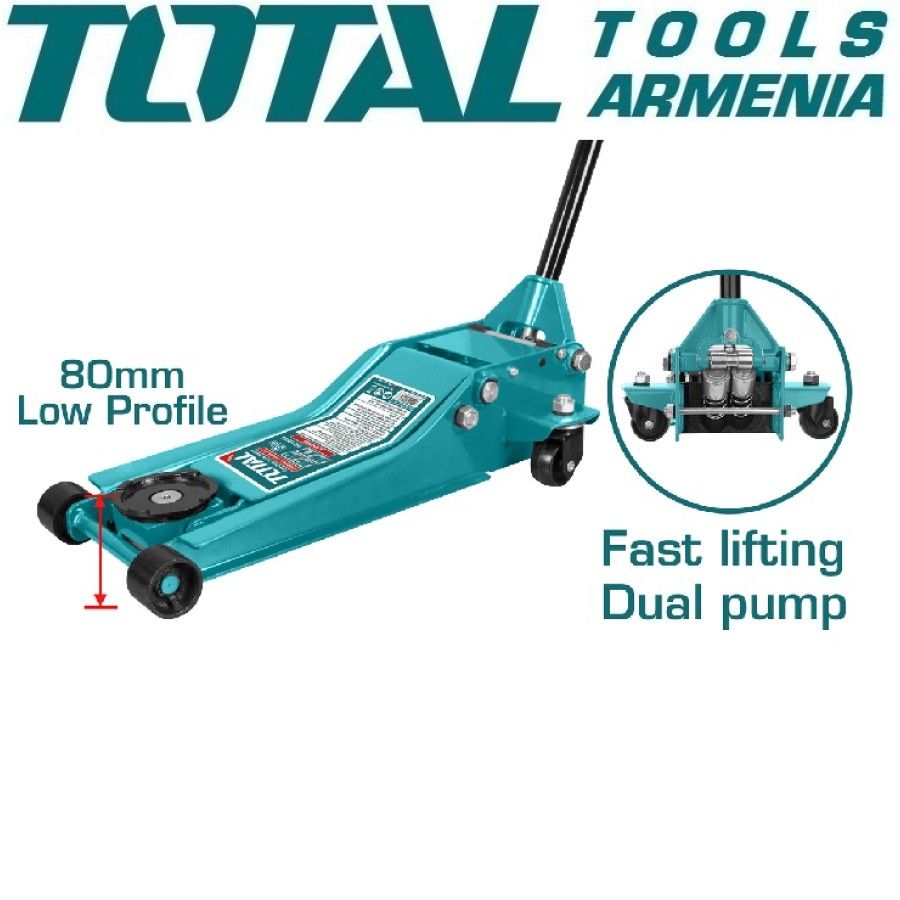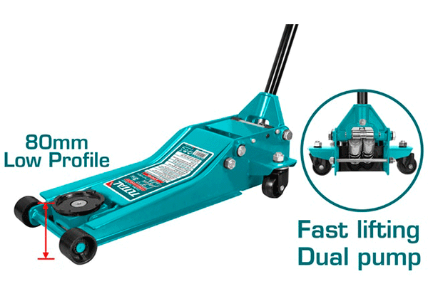 Домкрат гидравлический подкатной 3т TOTAL THT10834 Грузоподьемность 3т Высота подхвата 85мм Высота подьема 515мм Вес 32кг Материал корпуса металл Рабочий ход 430мм Быстрый подъем, сдвоенный насос 3 т. TOTAL THT10834 удобен в использовании при работе с автомобилями с небольшим клиренсом. Грузоподъемность рассчитана на работу с легковым транспортом. Имеется длинный рычаг и удобная рельефная рукоятка для переноски инструмента.