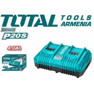 Двухпортовое быстрое интеллектуальное зарядное устройство 20 В TOTAL TFCLI2034 Тип - быстрое интеллектуальное зарядное устройство. Тип аккумуляторных батарей - Li-ion(Литий-ионный). Размеры - 230х160х90мм. Напряжение - 20В. Ток заряда - 4Ач. Заряжает аккумулятор 20 В, 2,0 Ач - за 0,5 часа (30 минут). Заряжает аккумулятор 20 В, 4,0 Ач - за 1 час (60 мин). Упаковано в цветную коробку. Емкость аккумулятора - 4000 мАч. Быстрое интеллектуальное зарядное устройство TOTAL TFCLI2034 подходит для зарядки аккумуляторов TOTAL с напряжением 20 В. Полная зарядка одного аккумулятора занимает примерно 1 час. Устройство оснащено светодиодным индикатором заряда.