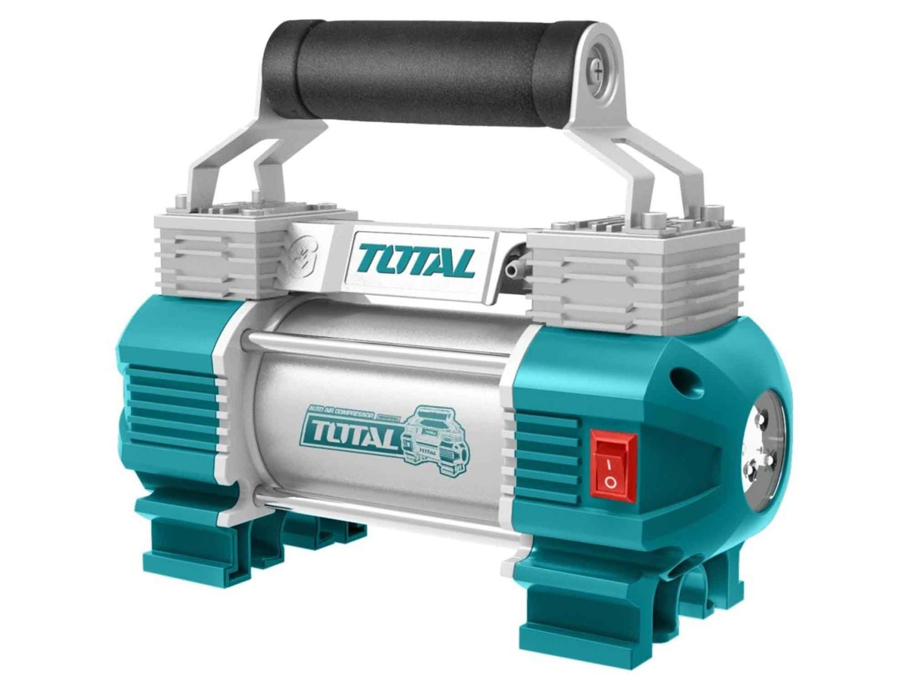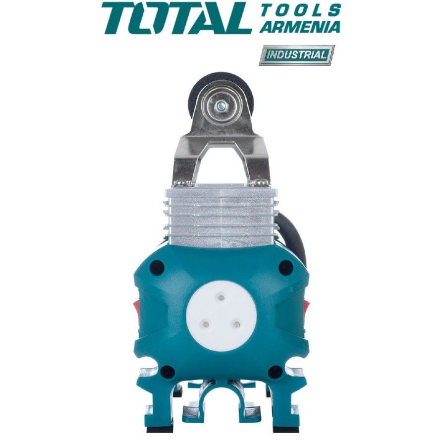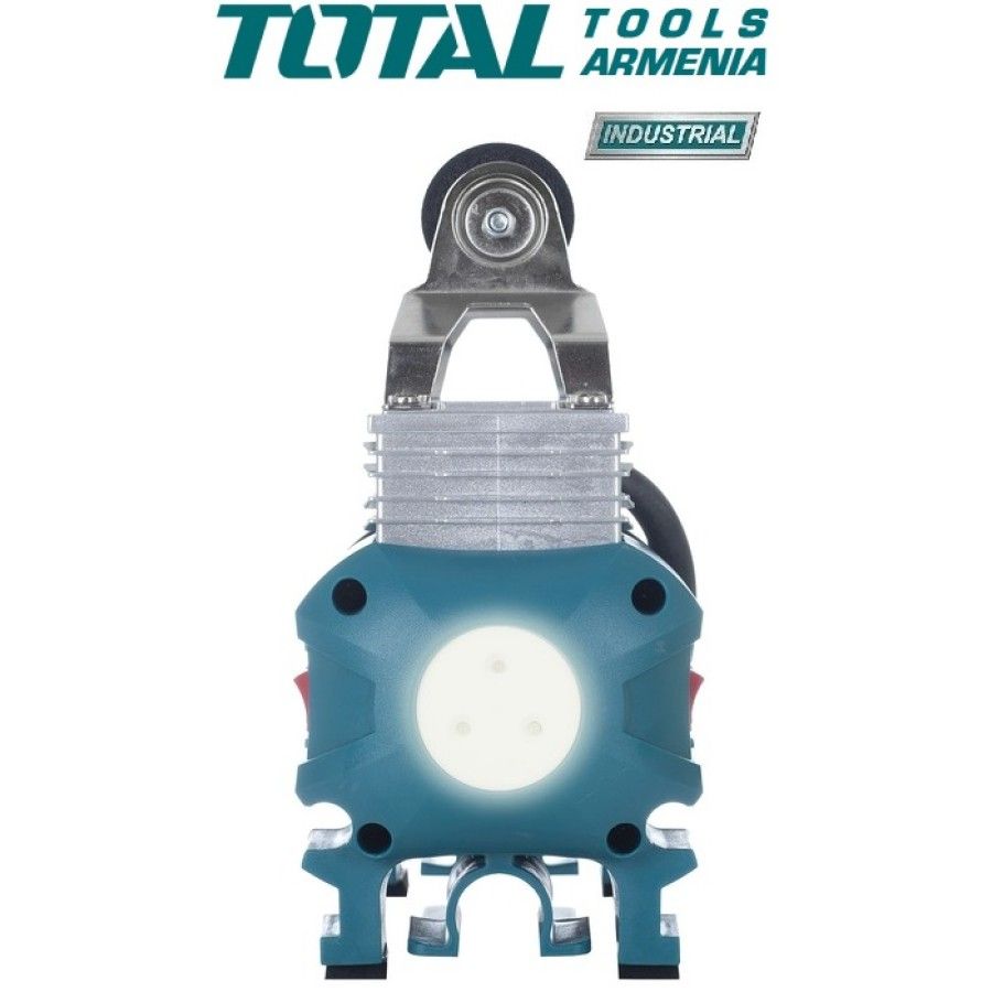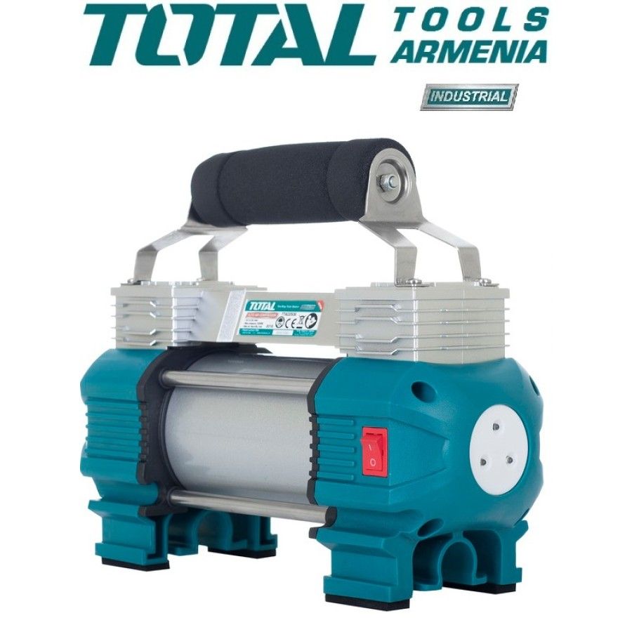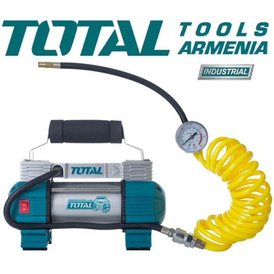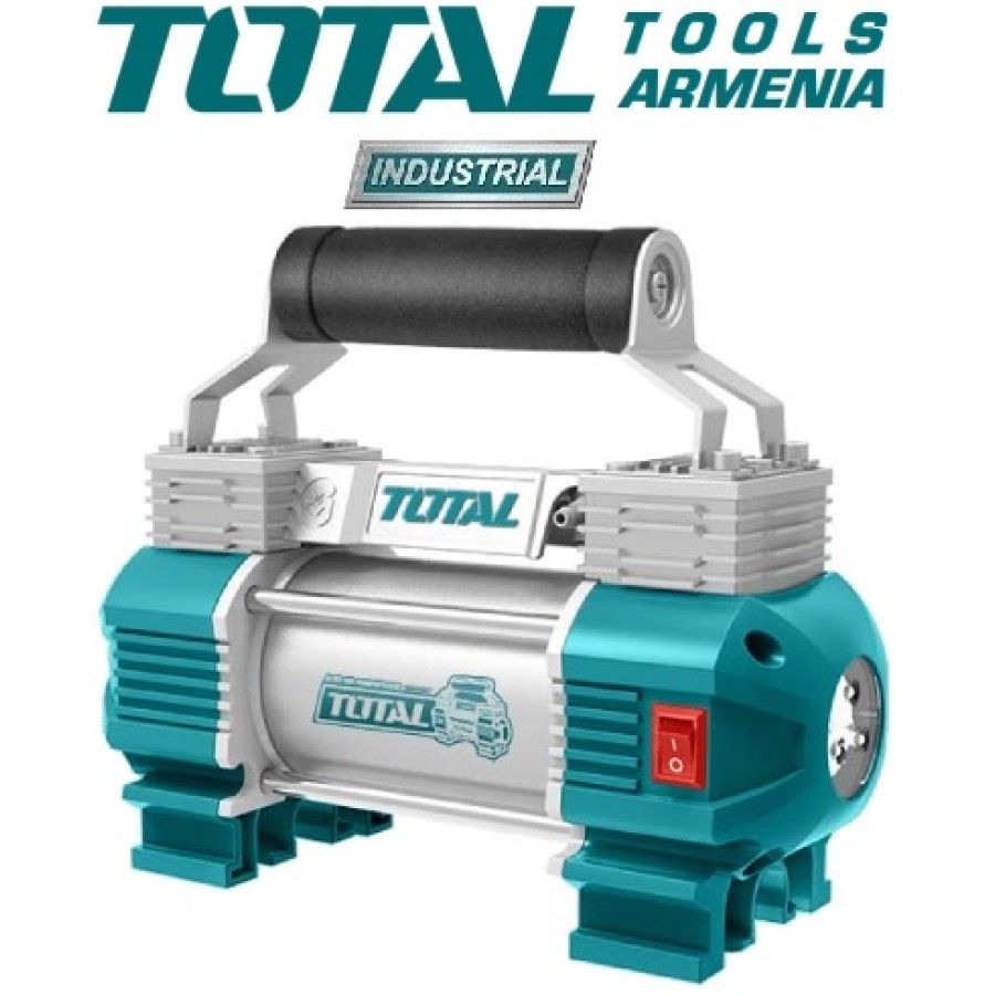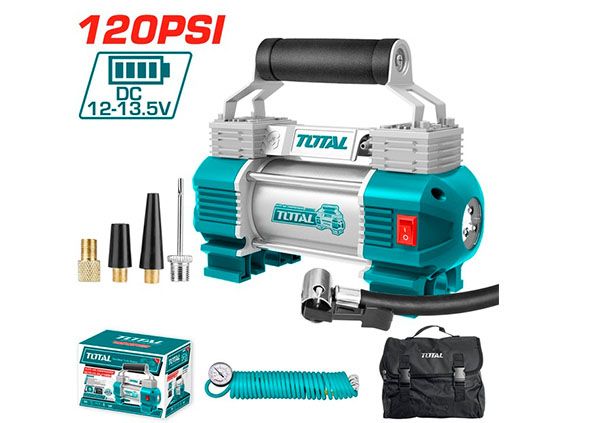 Автокомпрессор Total TTAC250612 В Автомобильный компрессор TOTAL TTAC2506 используется для накачки автомобильных и мотоциклетных шин. Устройство отличается низким уровнем шума, небольшими габаритами и простой в эксплуатации. Рукоять обеспечивает удобство транспортировки агрегата. Благодаря встроенному фонарю компрессор подходит для использования в качестве вспомогательного осветительного прибора в темное время суток. В комплекте: Воздуховод 5 м. с манометром 1 ч. Электрический шнур с аккумуляторными зажимами 3 м. 1 ч. Аппарат примерочный 4 ч. Фирменная сумка TOTAL Напряжение։ 12 В. Производительность при 0 бар: 45 л/мин Максимальное давление: 9 Атм. Цикл работы: 15 минут Максимальный потребляемый ток: 18 А. Количество выходов: 1 Вес 3.3 кг. Гарантия. 1 год