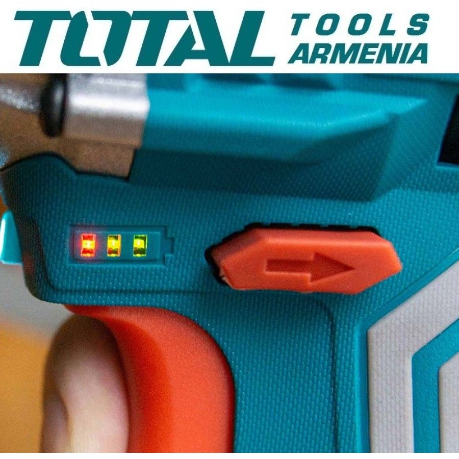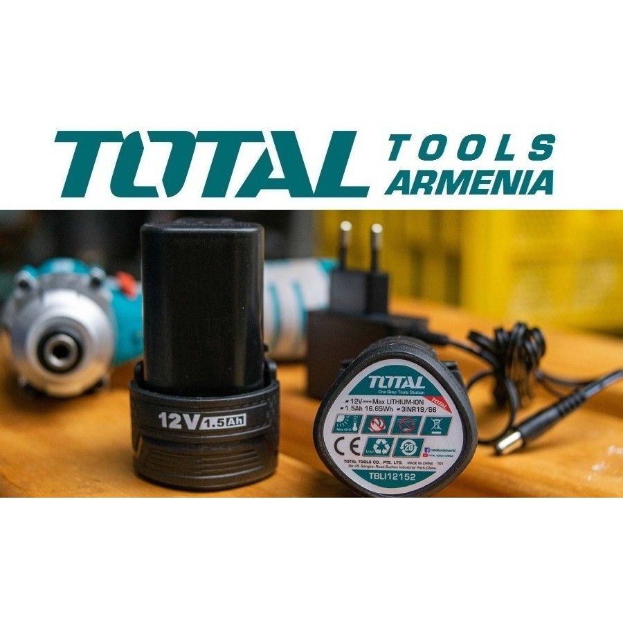 Аккумуляторный ударный гайковерт (винтоверт) -Дрель TotalTIRLI1201 12 В , 100Нм + 1 батарея Ударная винтоверт TIRLI1201 имеет 2 функции: дрель -гайковерт , продукт поставляется в очень солидном пластиковым чемоданом , включая: 1 корпус, 1 зарядное основание и 2 батареи . Аккумуляторный ударный гайковерт TotalTIRLI1201 является частью нового продукта, который Total выпускает в 2020 году, высокого качества, но с низкой ценой. Напряжение: 12 В Скорость холостого хода: 0-2000 / мин Максимальная скорость удара: 2800 / мин Максимальный крутящий момент: 20 Нм Шестигранный патрон: 1/4 дюйма (6,35 мм). С аккумулятором 2шт. С быстрым зарядным устройством 1 шт., 2 час Гарантия на обслуживание 1 год 2 штуки Cr-V бит +3 шт Силовые розетки6, 8, 10 мм ,Чемодан/Кейс. Для ослабления и выкручивания крепежа предусмотрена функция реверса. Встроенная подсветка позволяет работать в темное время суток или при плохом освещении. Модель функционирует от литий-ионного аккумулятора, который отличается легкостью и мощностью, отсутствием саморазряда и эффекта памяти Этот продукт питается от литиевой батареи 12 В , новая технология батареи должна помочь сделатьпродукт у более прочной и продлить срок ее эксплуатации, корпус изготовлен из слоя АБС, выдерживает силу и хорошая теплостойкость. Устройство имеет компактную конструкцию, которая удобна для хранения и переноски при необходимости.
