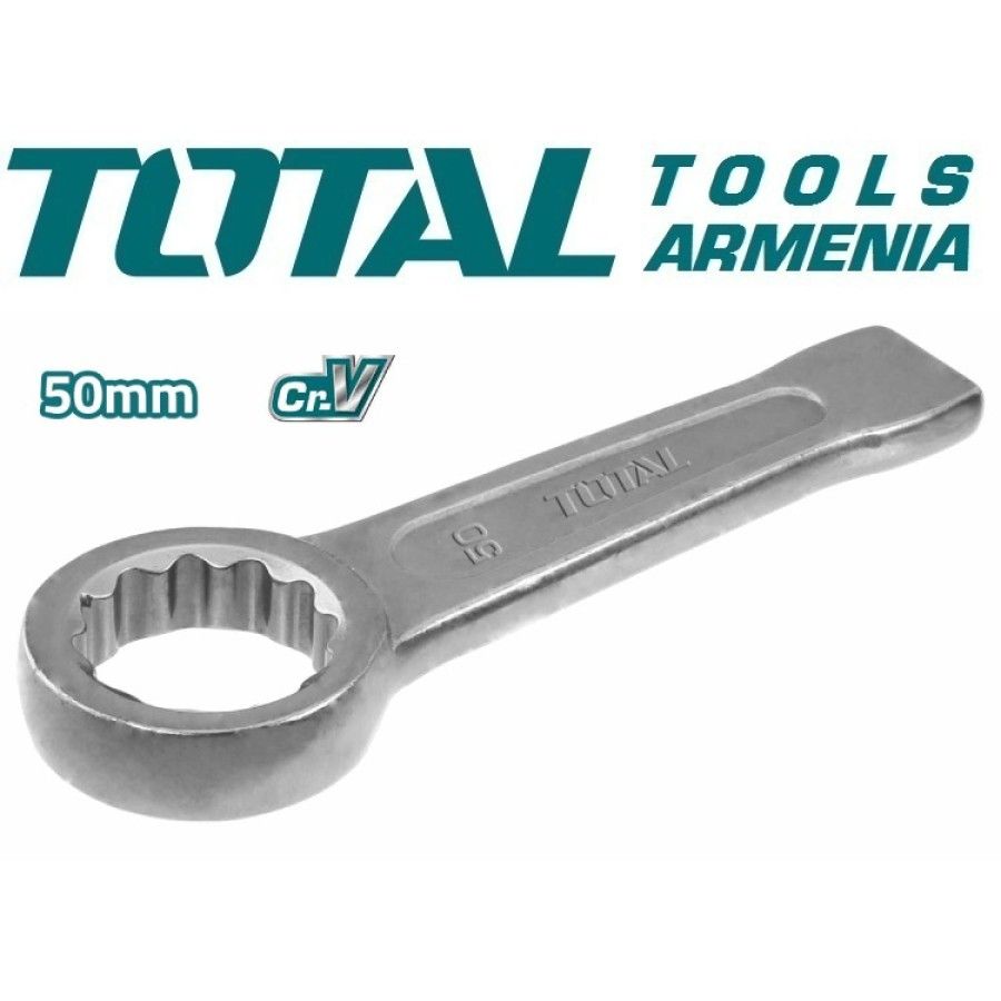 Гаечный ключ накидной 46мм TOTAL THT104050 Размер - 50мм. Тип - гаечный ключ. Материал - Cr-V. Форма - прямая. Длина - 255мм. Упаковано бумажной картой. Гаечный ключ накидной кольцевой 50мм применяется в мастерских и в сфере обслуживания. Отличие от обычного гаечного ключа - ударная накладка, рассчитанная на динамическое усилие.