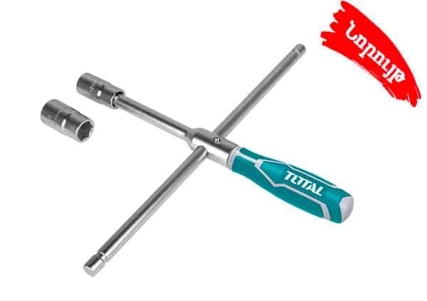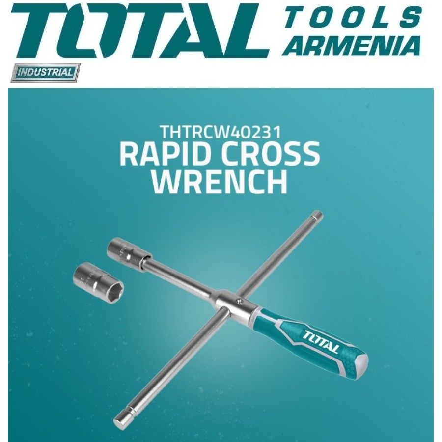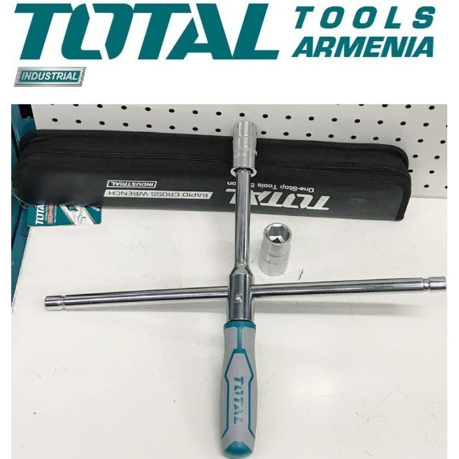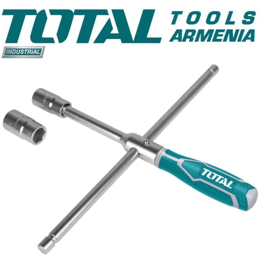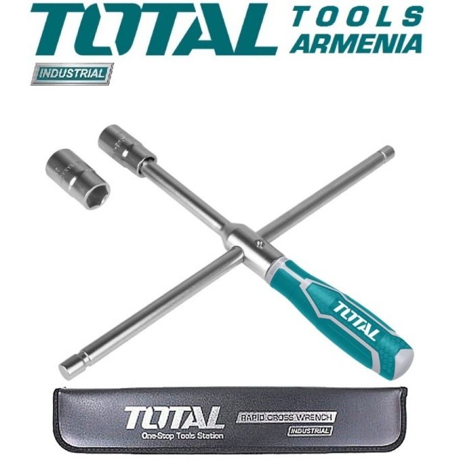 Ключ крестообразный 16дюймов TOTAL THTRCW40231 Размер - 400 мм (16 дюймов). 4 насадки 1/2 " - 17, 19, 21, 23 мм. Материал - Cr-V. Упакован в кожаную сумку. Ключ крестообразный это инструмент, который должен быть у водителя в случае вынужденной смены колеса на дороге. Кроме того, ключ используют в автомастерских. Инструмент изготовлен из прочной стали, имеет крестообразные концы - 17, 19, 21, 22 мм.