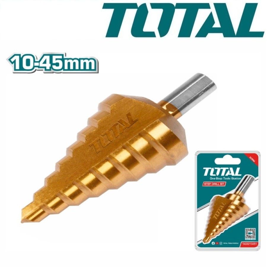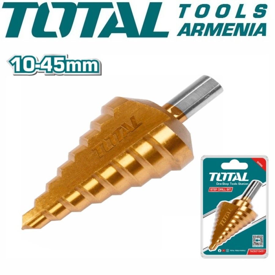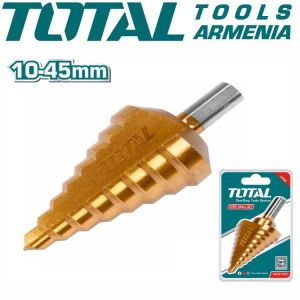 Коническое сверло 10-45мм TOTAL TAC75104501 Размер: 10-45 мм Размеры: 10-15-20-25-30-35-40-45 мм. Титановое покрытие Материал: HSS 4341. Упаковано в двойные блистеры.