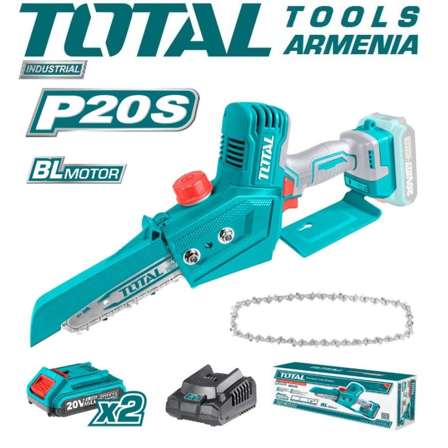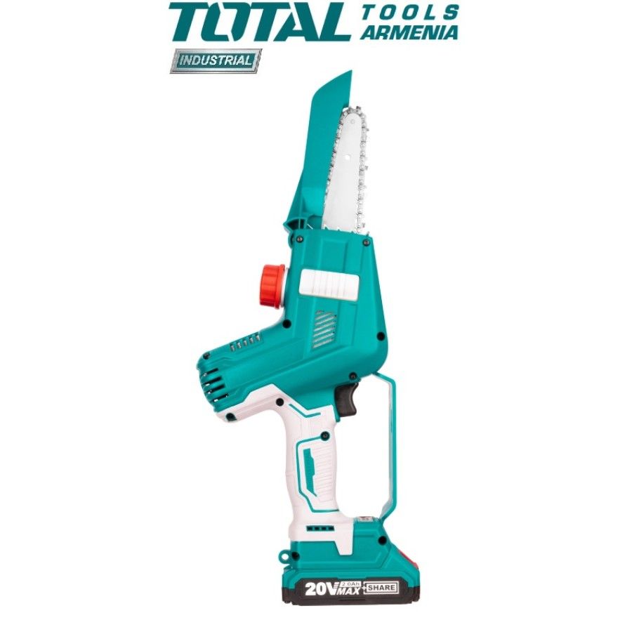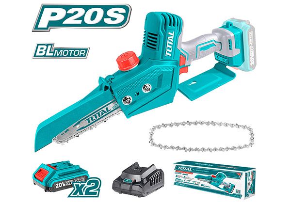 Литий-ионная мини-пила 20 В Total TGSLI20683 Напряжение батареи: 20 В Тип двигателя: бесщеточный. Мощность: 20В. Цепь: 1,1 мм - 1/4 ''. Вес 1,5 кг. С аккумуляторной батареей 2 шт. 2,0 Ач С 1 шт. быстрым зарядным устройством Запасные части: Мини Цепь TGSLI20683-SP-30 Мини Шина TGSLI20683-SP-31 Аккумуляторная электрическая пила TOTAL TGSLI20683 Цепная пила Total предназначена для быстрого распила свежей, сухой и влажной древесины различной толщины и конфигурации, ДСП, древесины из мелких и средних бревен.
