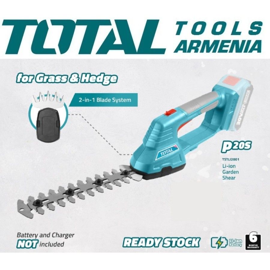 Литий-ионные садовые ножницы TOTAL TSTLI2001 Модель №. TSTLI2001 Напряжение 20В Максимум. скорость 1200 / мин Расстояние между зубьями 8 мм Материал лезвия Углеродистая сталь SK5 Батарея в комплект не входит, совместима с батареями 2,0 Ач и 4,0 Ач Зарядное устройство в комплект не входит Запасные части: Эксцентриковый Шлиц TSTLI2001-SP-12 Электрические ножницы предназначены для придания формы декоративным заборам в приусадебных участках. Оборудован пластиковым кожухом для защиты руки пользователя и режущими лезвиями длиной 41 см. Способен обрезать ветки толщиной до 20 мм.