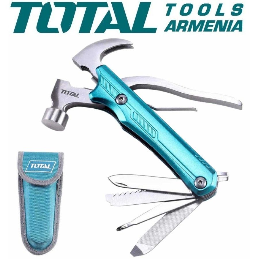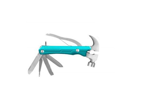 Многофункциональный молоток TOTAL THMFH0126 Многофункциональный молоток Количество предметов: 12 Прочная алюминиевая рукоятка Упаковано сумка для переноски. 1. Плоскогубцы. 2. Обычные плоскогубцы. 3. Шестигранный ключ. 4. Гвоздодер 5. Кусачки. 6. Большой нож 7. Пила по дереву 8. Дегоржер / съемник крючков. 9. Отвертка шлицевая. 10. Крестовая отвертка. 11. Металлический напильник. 12. Напильник по дереву