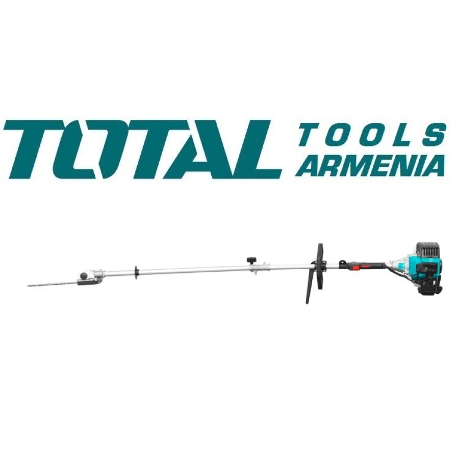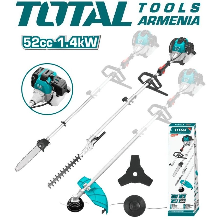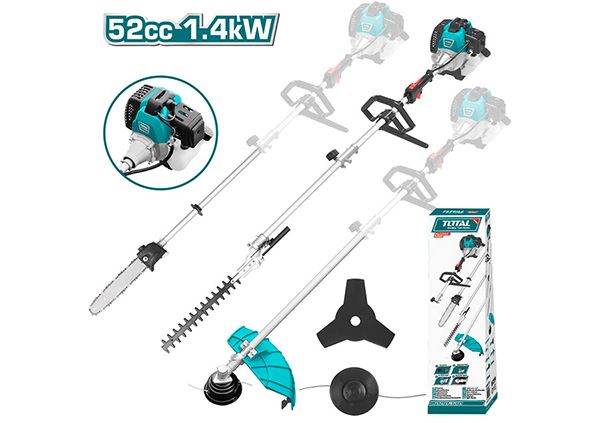 Мультифункциональный бензиновый триммер 1,4кВт TOTAL TMT55211 Многофункциональный бензиновый триммер – незаменимый помощник в саду. Предназначен для скашивания травы и молодых кустарников, а также для ухода за садовыми деревьями и декоративными кустарниками. В комплект входит двухплечевой ремень, он равномерно распределяет нагрузку на оператора, что обеспечивает комфорт при работе. Топливный бак с полупрозрачными стенками позволяет держать уровень топлива под визуальным контролем и своевременно дозаправляться. Мощность: 1,4 кВт. Мощность: 2,2 л.с. Обороты: 10000 об/мин. Рабочий объем: 52 куб.см. Емкость: 1200 мл. Ширина реза: 420 мм. Ширина режущей кромки: 255 мм. Вес: 11,7 кг. Гарантия: 1 год. 2-тактный двигатель. С 1шт триммером для травы. С 1 кусторезом ( TGTBCB95 ). С 1 шт. триммером для живой изгороди. С цепной пилой 1 шт. Упаковано в цветную коробку.