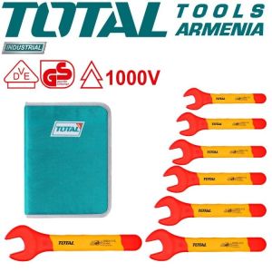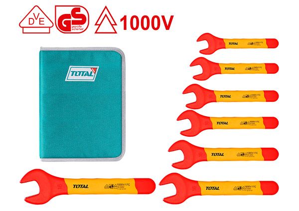 Набор гаечных ключей диэлектрических, 7 шт TOTAL THKISPA0701 Размер мин. 8мм Размер макс 19 мм Тип Набор гаечных ключей Материал Cr-V Количество в наборе 7шт. Форма прямая Размеры гаечных ключей 8 мм, 10 мм, 12 мм, 13 мм, 14 мм, 17 мм, 19 мм, Для работы с шестигранником используется рожковый ключ. Возможно использование инструмента для электромонтажных работ с переменным током до 1000 В.