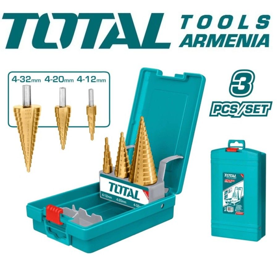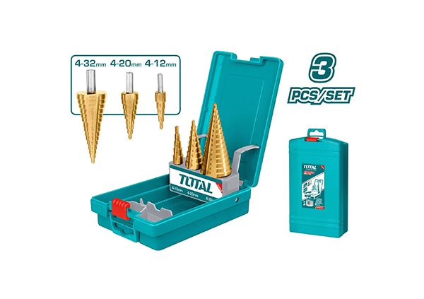 Набор конических сверл 3 шт. TOTAL TACSD2031 Набор ступенчатых сверл из 3 предметов 1шт 4-12мм, 1мм/шаг, диаметр соединения: 6мм 1шт 4-20мм, 2мм/шаг, диаметр соединения: 8мм 1шт 4-32мм, 2мм/шаг, диаметр соединения: 10мм Материал: быстрорежущая сталь Применимо для стальной пластины толщиной ≤ 3 мм. Упаковано в пластиковую коробку.