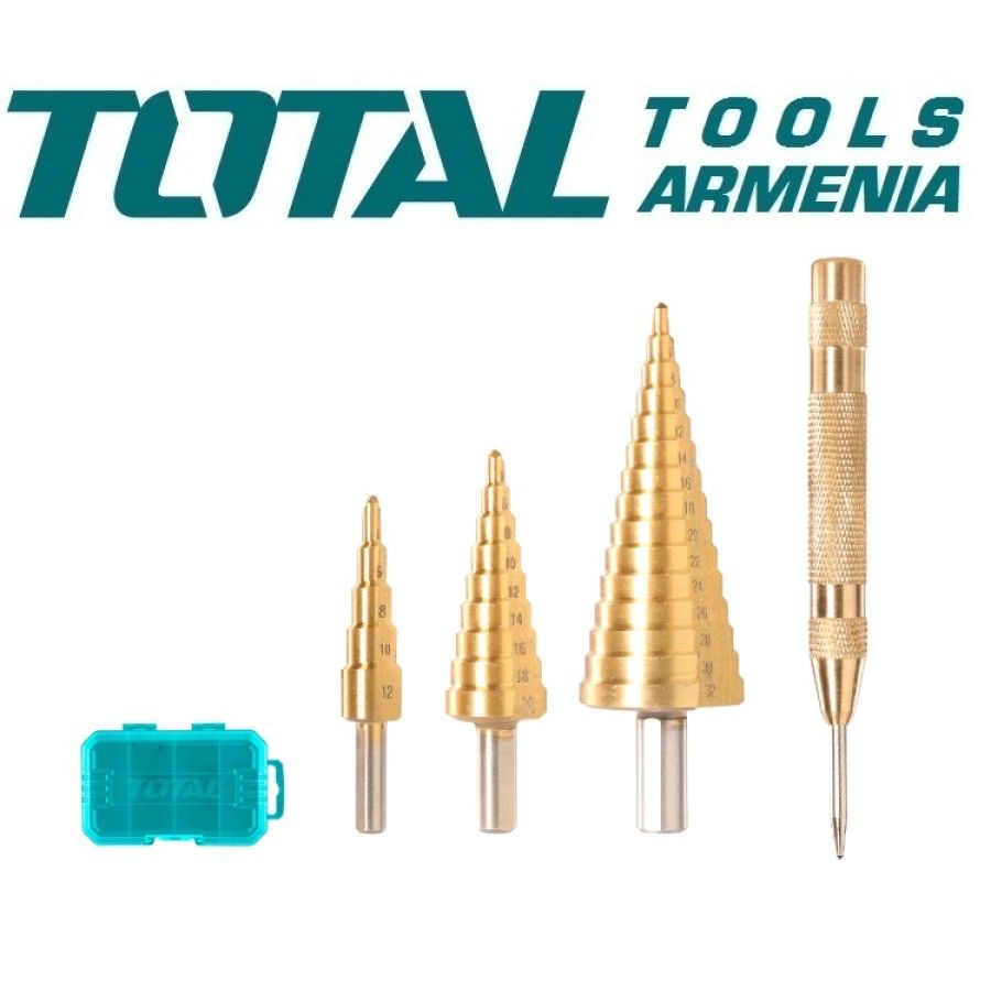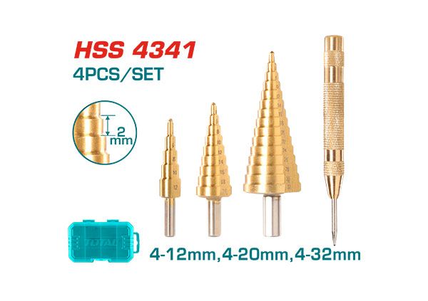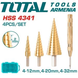 Набор конических сверл 4 шт. TOTAL TACSD2041 Набор ступенчатых сверл из 3 предметов 1шт 4-12мм, թмм/шаг, диаметр соединения: 6мм 1шт 4-20мм, 2мм/шаг, диаметр соединения: 8мм 1шт 4-32мм, 2мм/шаг, диаметр соединения: 10мм 1шт центральный дырокол Материал: быстрорежущая сталь Применимо для стальной пластины толщиной ≤ 3 мм. Упаковано в пластиковую коробку.