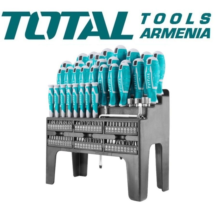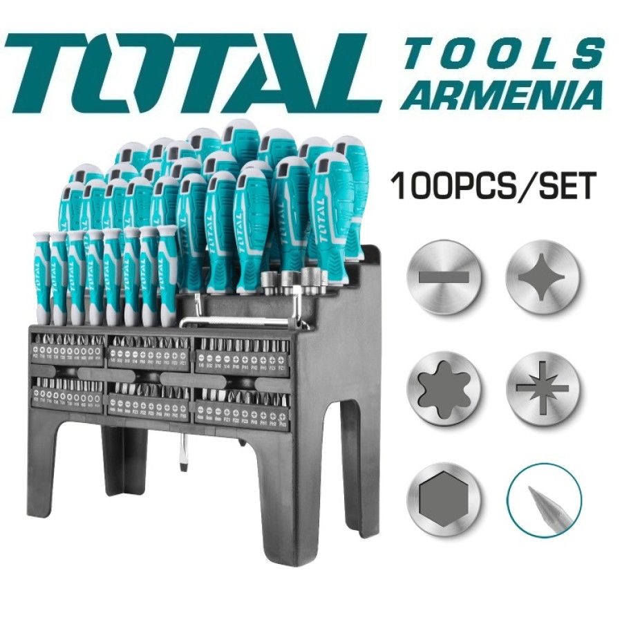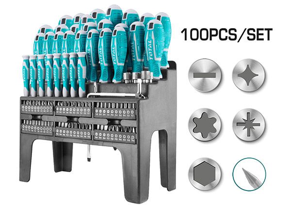 Набор отверток с битами 100 шт. TOTAL THT2506100 Кол-во единиц 100шт. Тип паза SL, PH, PZ, TORX, HEX Материал Cr-V Материал ручки ПВХ 8 шт. Шлицевые отвертки - SL3x75 мм, SL4x100 мм, SL5x75 мм, SL5x100 мм, SL5x125 мм, SL6x100 мм, SL6x150 мм, SL8x150 мм Отвертки Phillips 8 шт. - PH0x75 мм, PH0x100 мм, PH1x75 мм, PH1x100 мм, PH1x150 мм, PH2x100 мм, PH2x150 мм, PH3x150 мм 3 отвертки Torx - T10x100x3 мм, T15x100x3,5 мм, T20x100x4 мм Отвертка с магнитным хвостовиком, 1 шт. - 7x100 мм 1шт шило - 3x75мм Прецизионная отвертка 8 шт. - SL1.5x50mm, SL2.5x50mm, PH000x50mm, PH00x50mm, PH0x50mm, T6x50mm, T8x50mm, T10x50mm 60 бит отверток - 2шт SL3, 2шт SL4, 3шт SL5, 3шт SL6, 2шт SL7, 2шт PH0, 3шт PH1, 3шт PH2, 2шт PH3, 2шт PZ0, 3шт PZ1, 3шт PZ2, 2шт PZ3, 1шт H1.5, 1шт H2 , 1шт H2.5, 1шт H3, 2шт H4, 1шт H5, 1шт H5.5, 2шт H6, 2шт T8, 2шт T9, 2шт T10, 2шт T15, 2шт T20, 2шт T25, 2шт T27, 2шт T30, 2шт T40 2 отвертки Z-образные двусторонние - SL5xPH1, SL6xPH2 Головка 1/4 дюйма 6 штук - 5 мм, 6 мм, 7 мм, 8 мм, 9 мм, 10 мм Пластиковая рамка 1шт Упакован в двойной блистер Набор отверток TOTAL THT2506100, это универсальный ручной инструмент для ремонта, монтажа и демонтажа. В комплект входит большое количество бит с разными типами шлицев, что позволяет выполнять широкий спектр операций по обслуживанию крепежа. Насадки для отверток изготовлены из высокопрочной хромованадиевой стали. Ручка имеет эргономичную форму и не выскальзывает из рук.