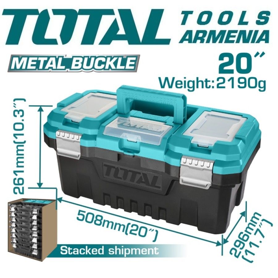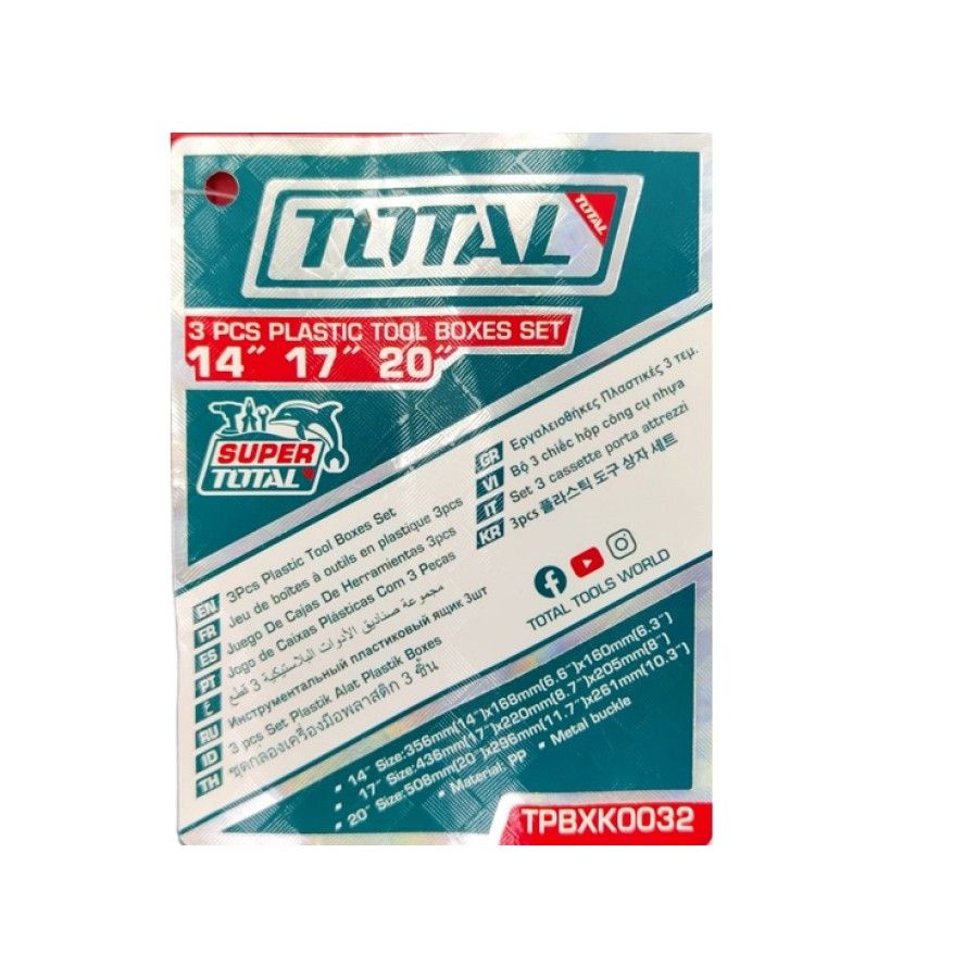 Набор пластиковых ящиков для инструментов 3шт. TOTAL TPBXK0032 Материал ПП Размер 14 дюймов: 356 мм (14 дюймов) x 168 мм (6,6 дюйма) x 160 мм (6,3 дюйма) Размер 17 дюймов: 436 мм (17 дюймов) x 220 мм (8,7 дюйма) x 205 мм (8 дюймов) Размер 20 дюймов: 508 мм (20 дюймов) x 296 мм (11,7 дюйма) x 261 мм (10,3 дюйма) Ручка повышенной прочности Металлическая пряжка