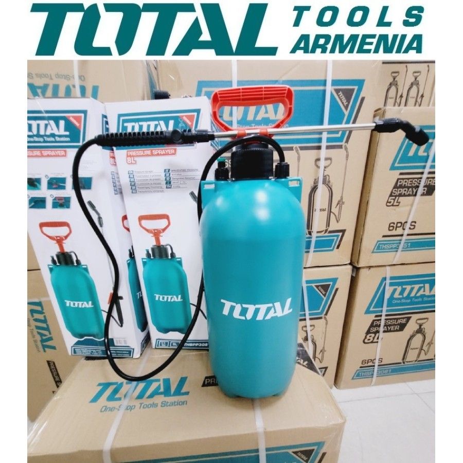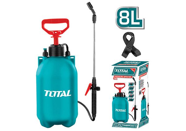Напорный опрыскиватель 8 литров TOTAL THSPP3081 Емкость 8 литров Предохранительный клапан сброса давления Удобный ремень для переноски Давление 2,5 бар гибкий шланг длиной 1,2 м Триггер ВКЛ/ВЫКЛ с блокировкой триггера Регулируемый спрей Упаковано в цветную коробку Ручной опрыскиватель используется при работе в саду. Полезен для распыления жидких удобрений и щадящего орошения растений. Опрыскиватель имеет широкое горлышко для удобного заполнения бака. Наличие плечевого ремня позволяет легко переносить изделие.