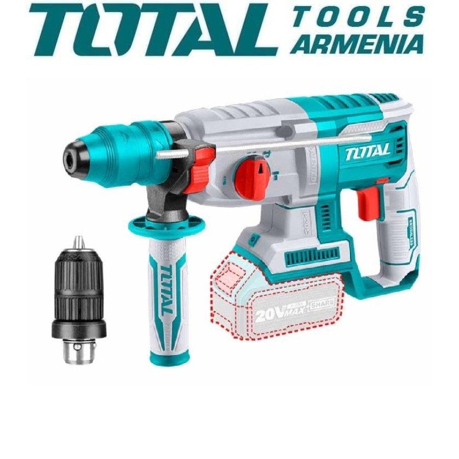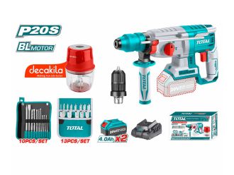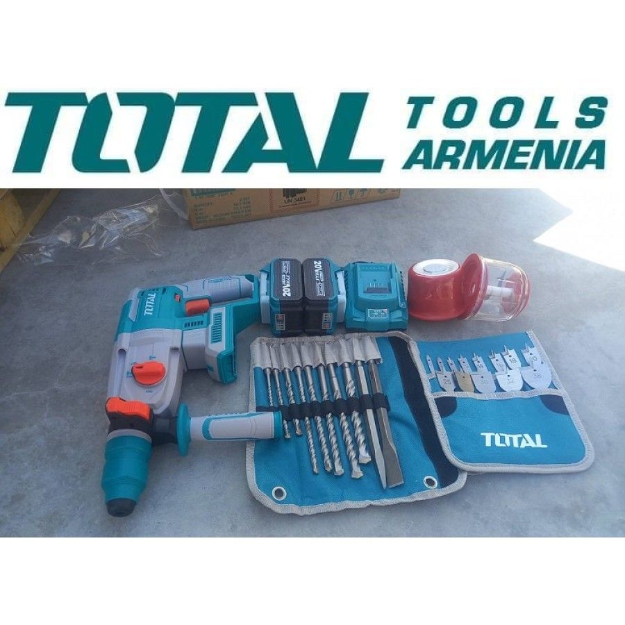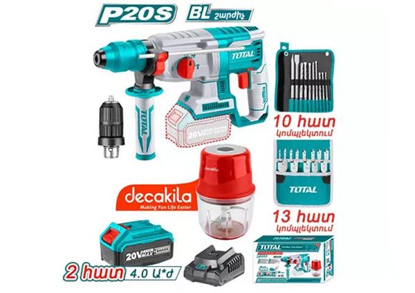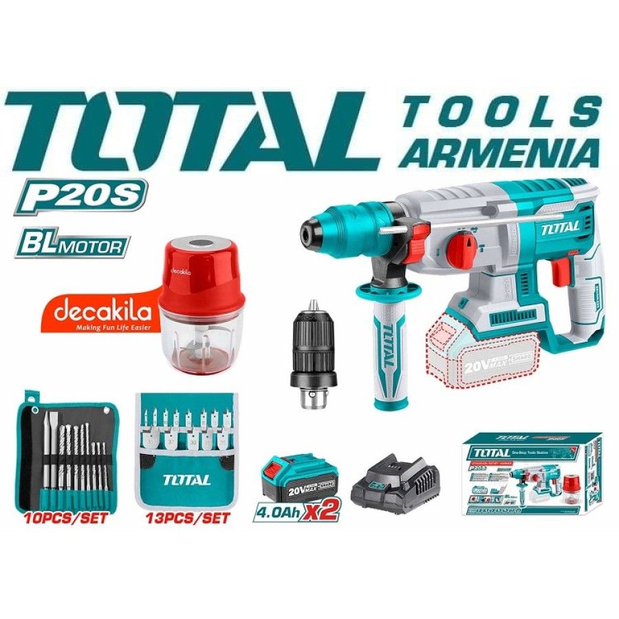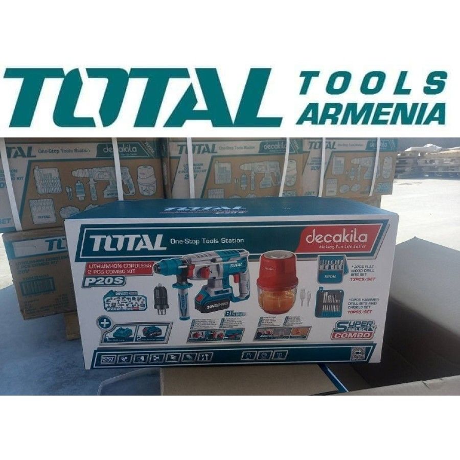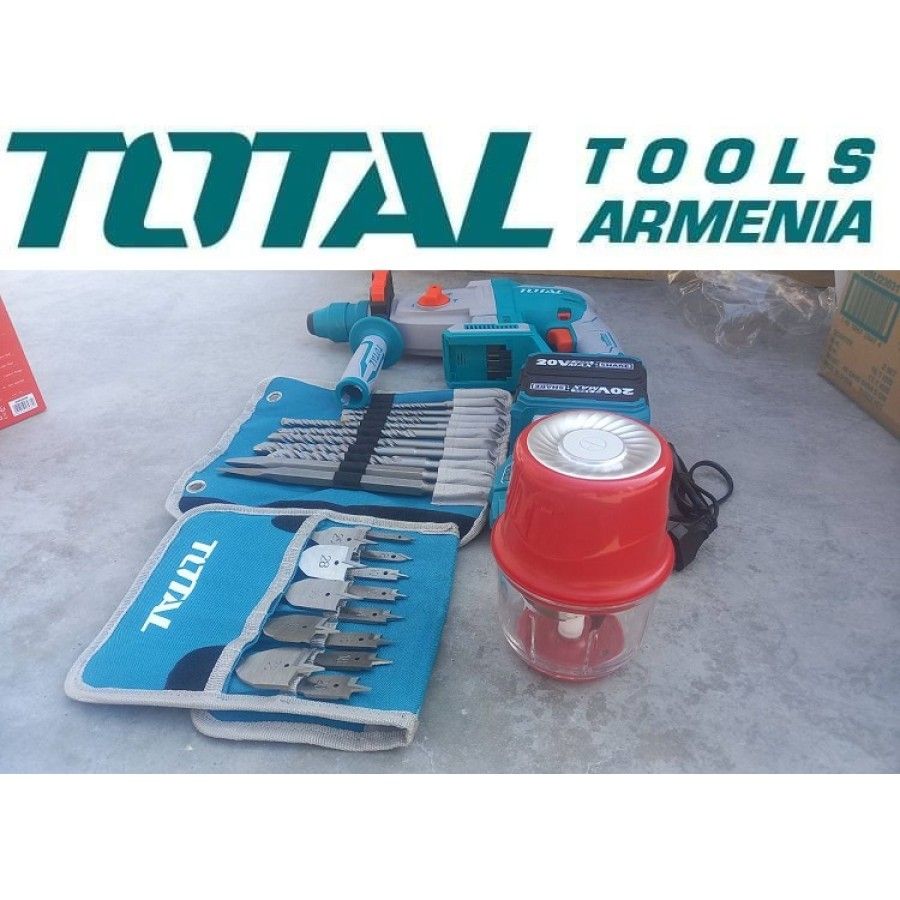 Комбо-набор 2 предмета TOTAL TOSLI23031 Перфоратор:TRHLI202289 Напряжение: 20 В. Скорость без нагрузки: 0 - 1100 об/мин. Частота ударов: 0 - 5000 ударов в минуту. Сила удара: 2,0 Дж. Максимальная глубина сверления в бетоне: 26 мм, в стали: 13 мм, в дереве: 30 мм. Встроенный рабочий светодиодный фонарь. С системой патрона SDS plus. Аккумуляторный мини-измельчитель: KMMG008R Емкость: 0,3 л стеклянный контейнер. Емкость аккумулятора: 1500 мАч. Напряжение: 3,7 В постоянного тока. Мощность: 30 Вт. Количество лезвий: 3. Функции : Имеет контроль скорости. Подходит для приготовления пищи для детей. Управляется с помощью одной кнопки. Легко измельчает твердые кусочки пищи в пюре. Особенности лезвия из нержавеющей стали типа S. Контейнер и лезвия можно мыть в посудомоечной машине. В коллекцию также входят: 1 x быстрозажимной патрон. 1 х USB-кабель для зарядки. 2 аккумуляторные батареи 4,0 Ач (TFBLI2002). 1 батарея (TFCLI2001). Напряжение: 220-240 В ~ 50/60 Гц. 8 шт. сверл SDS plus: (6X160 мм, 8X160 мм, 10X160 мм, 8X210 мм, 10X210 мм, 12X210 мм, 14X210 мм, 16X210 мм). 2 лезвия SDS Plus: (14X250 мм, 14X250X20 мм). 13 плоских сверл по дереву: (6,8,10,12,14,16,18,20,25,28,30,32,38 мм).