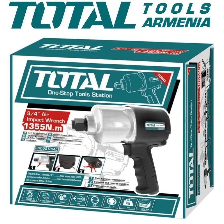 Пневматический ударный гайковерт 1355 Нм/6.2 атм-3/4 дюйма TOTALTAT40341 Ударный гайковерт TOTALприменяется для закручивания и откручивания крепежа. Ударный механизм позволяет работать с прикипевшими и приржавевшими резьбовыми соединениями. Принцип работы на сжатом воздухе обеспечивает внушительный рабочий ресурс. Инструмент имеет прочный корпус, который надежно защищает внутренние узлы от механических повреждений. Возможность работы без остановки в течение длительного времени. Запасные части : РоторTAT40341-SP-27 Max крутящий момент: 1355 Нм. Давление:6.2атм. Частота вращения шпинделя:7000 об/мин. Расход воздуха:269л/мин. Размер патрона: 3/4 дюйма Наличие реверса: естьНаличие удара: да Вес։ 3 кг. Гарантия։ 1 год