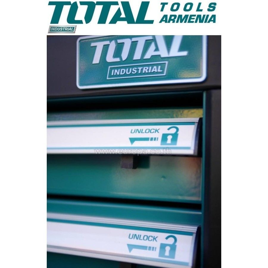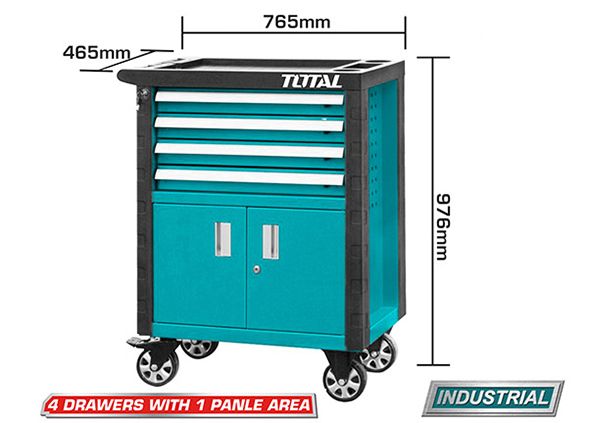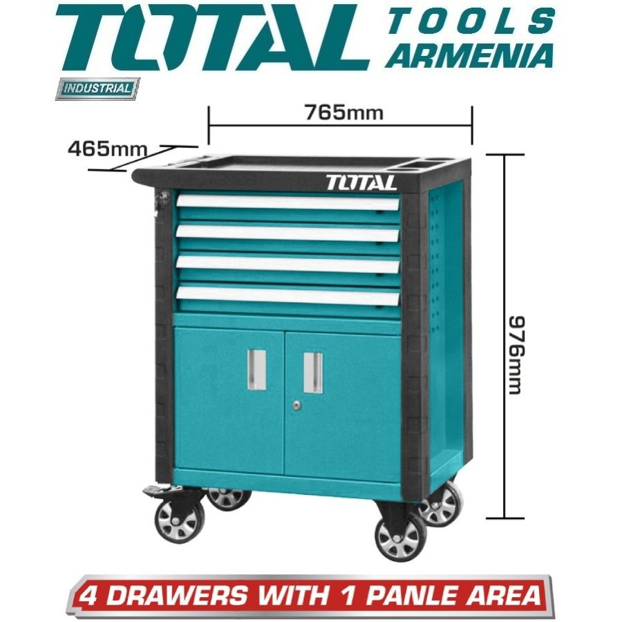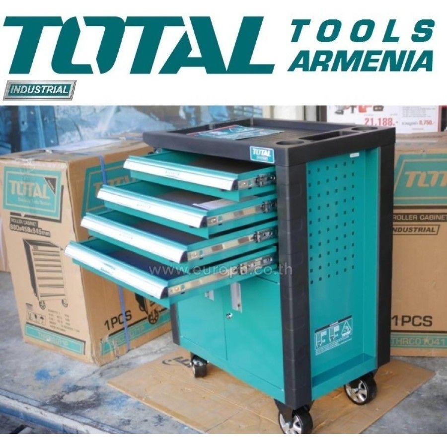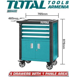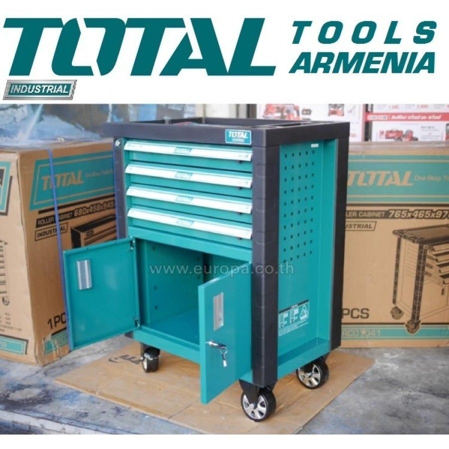 Шкаф на колесиках 4 ящиков TOTALTHRC01041 С 4 ящиками. Габаритные размеры:765x465x812 мм. Габаритные размеры с роликами:765x465x976 мм. Размер роликов: 5 дюймов x 2 дюйма. Толщина корпуса: 0,8-1,0 мм. Толщина ящика: 0,7 мм. С ящиком 4 шт. 536x410x74,5 мм. С большим ящиком 560x420x395 мм 1шт. Шкаф поставляется без инструментов. Упаковано в пенопласт EVA + картонная коробка + поддон. Шкаф предназначен для удобного хранения инструмента разного размера и назначения. Его можно разместить в гараже или небольшой мастерской. Состоит из семи ящиков разных размеров. Ящики закрываются на ключ для безопасного хранения. Для удобства передвижения шкаф оборудован четырьмя колесиками.