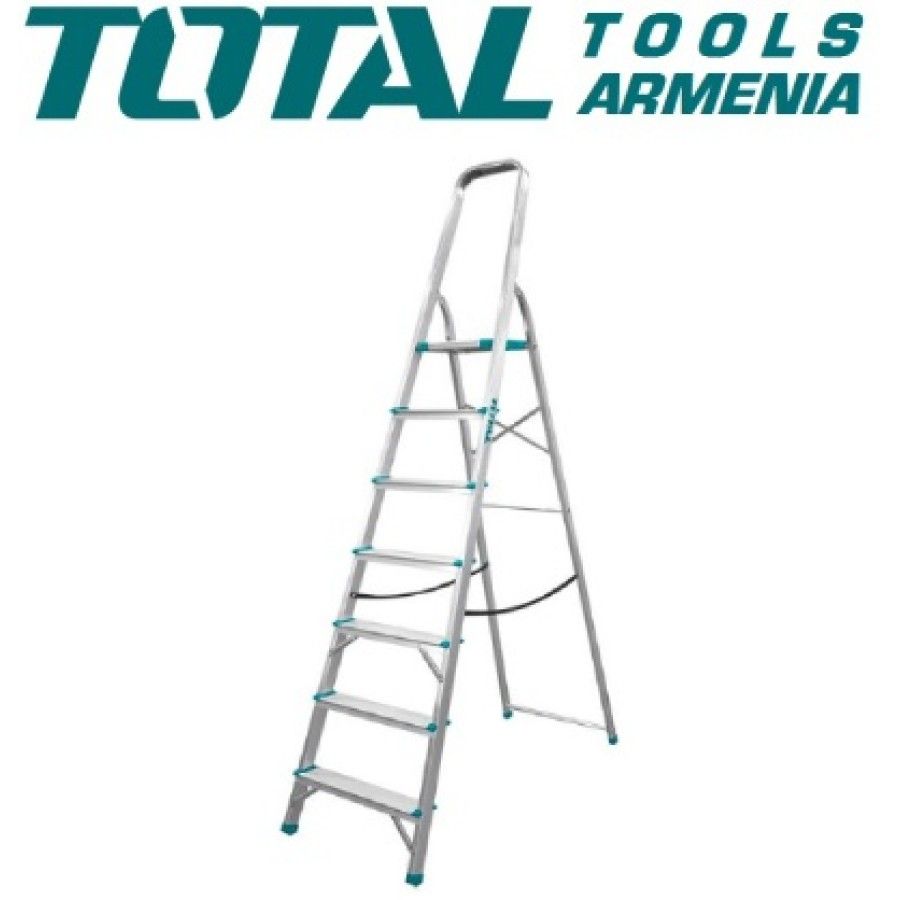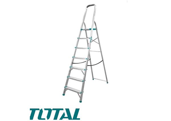 Стремянка 7 ступени TOTAL THLAD06071 Размер верхней ступеньки - 260х250х30мм . Шаги - 7. Вес груза - 150кг. Вес - 4.9 кг. Материал - алюминий. Высота между двумя ступенями - 233мм. Высота между верхней ступенькой и ручкой - 605 мм. Высота от земли до верхней ступеньки - 1500мм. Стремянка TOTAL способна выдержать вес 150 кг. Подходит для частного использования. Достоинства модели: устойчивость к коррозии и механическим повреждениям, широкие рифленые ступени.