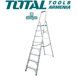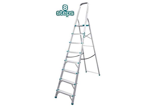Стремянка 8 ступени TOTAL THLAD06081 Размер верхней ступеньки - 260х250х30мм . Шаги - 8. Вес груза - 150кг. Вес - 5.4 кг. Материал - алюминий. Высота между двумя ступенями - 233мм. Высота между верхней ступенькой и ручкой - 605 мм. Высота от земли до верхней ступеньки - 1718мм. Стремянка TOTAL способна выдержать вес 150 кг. Подходит для частного использования. Достоинства модели: устойчивость к коррозии и механическим повреждениям, широкие рифленые ступени.