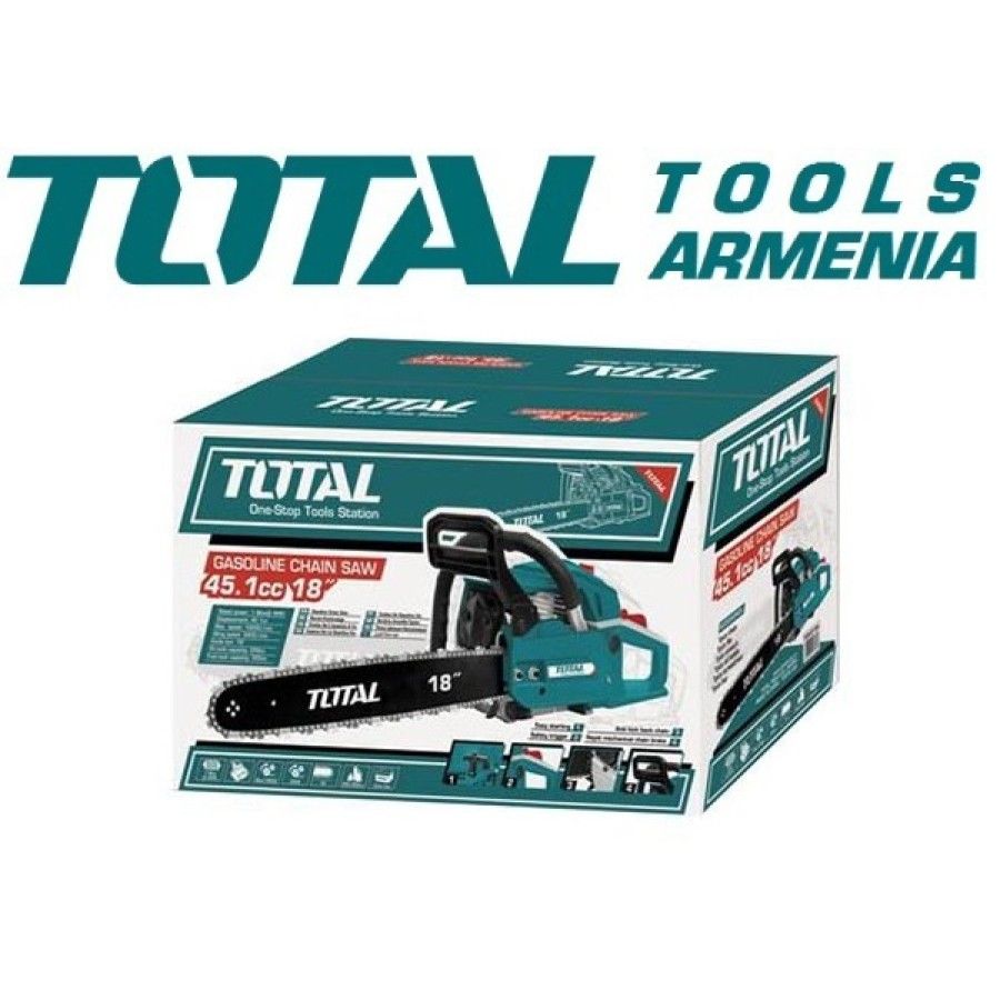 Цепная пила TOTAL TG945185 1.8 Кв Цепная бензопила Total предназначена для быстрого распиления свежей, сухой и мокрой древесины различной толщины и конфигурации, древесностружечных плит, заготовки дров из бревен малого и среднего диаметра. Благодаря использованию современных разработок и технологий цепные пилы наделены хорошими рабочими характеристиками работы двигателя, а также отличаются долговечностью и износостойкостью основных частей и деталей. По своей конструкции бензопилы относятся к простым классическим механизмам — цепь приводится в действие двигателем внутреннего сгорания. Простота устройства бензопилы является фактором надежности, обеспечивает ее безотказную работу в тяжелых условиях. Запасные части: Карбюратор TG945185-SP-E64 Воспламенитель TG945185-SP-E92 Поршень/Кольцо/Тормоз/Штифт TG945185-SP-E16-E19 Мощность: 1.8 Кв . Оборотов: 3200 об/мин. Мощность 2.5 л.с. Длина шины: 450 мм. Скорость вращения цепи: 21.2 мс. Двигатель:2-x тактный. Объем топливного бака: 0.55 Л. Объем масляного бака: 0.26 Л. Вес: 8.5 кг. Гарантия: 1 Года.