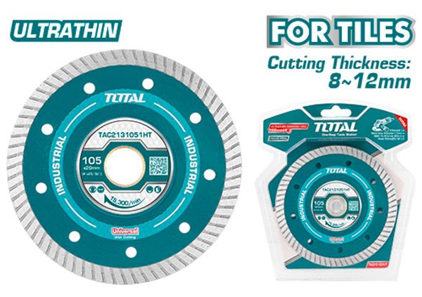 Ультратонкий алмазный диск 230X22.2 мм TOTAL TAC2132301HT Диаметр - 230мм. Отверстие под диск - 22.2 мм. Толщина - 1.6 мм. Для - керамика, кафель, мрамор, кирпич. Тип диска - алмазный. Алмазный диск сверхтонкий TOTAL TAC2132301HT изготовлен из высококачественного сплава. предназначен для использования на ручных угловых шлифовальных машинах при резке бетона, гранита, мрамора, кирпича, керамической плитки и других твердых строительных материалов. Уменьшенная толщина лезвия увеличивает скорость резки вдвое. Высокопрочные алмазные сегменты для эффективной резки.