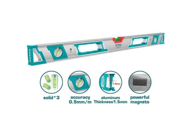 Уровень магнитный 1500мм TOTAL TMT215086M Длина 1500мм Количество глазок 3 шт. Наличие магнита - да Уровень магнитный TOTAL TMT215086M — измерительный прибор, определяющий отклонение поверхности по горизонтали и вертикали. Оснащен двумя мощными магнитами. Точность пузырьков составляет 0,5 мм/м, что обеспечивается двухсторонним фрезерованием поверхности изделия. Алюминиевый корпус толщиной 1,5 мм обладает прочностью и выдерживает значительные нагрузки.